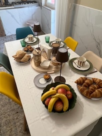 I had been in the B&B, and cabin rental business for a time a while back, and have to say this hostess and her property blew me away! Where to begin? … Maria met us to deliver the keys, and reveal some goodies. The kitchen table was set, and loaded with local baked goods; the refrigerator contained juice, yogurt, ham, cheese, and a bottle of wine among other things. The front porch, as well as the back terrace were wonderful on the warm days. We took a few meals out back, and often chilled out on the front porch in the evening. The house was spotless throughout. The beds were comfortable and cozy. Linens for the beds and baths were top notch.We were traveling with a 12 year old. We found a community football field right down the street and grandson was able to get in some fun face time with local children willing to kick around the ball some.The location of Maria’s house is conveniently situated close to in town and local markets.All in all we highly recommend this rental, and its hosts without any doubts.