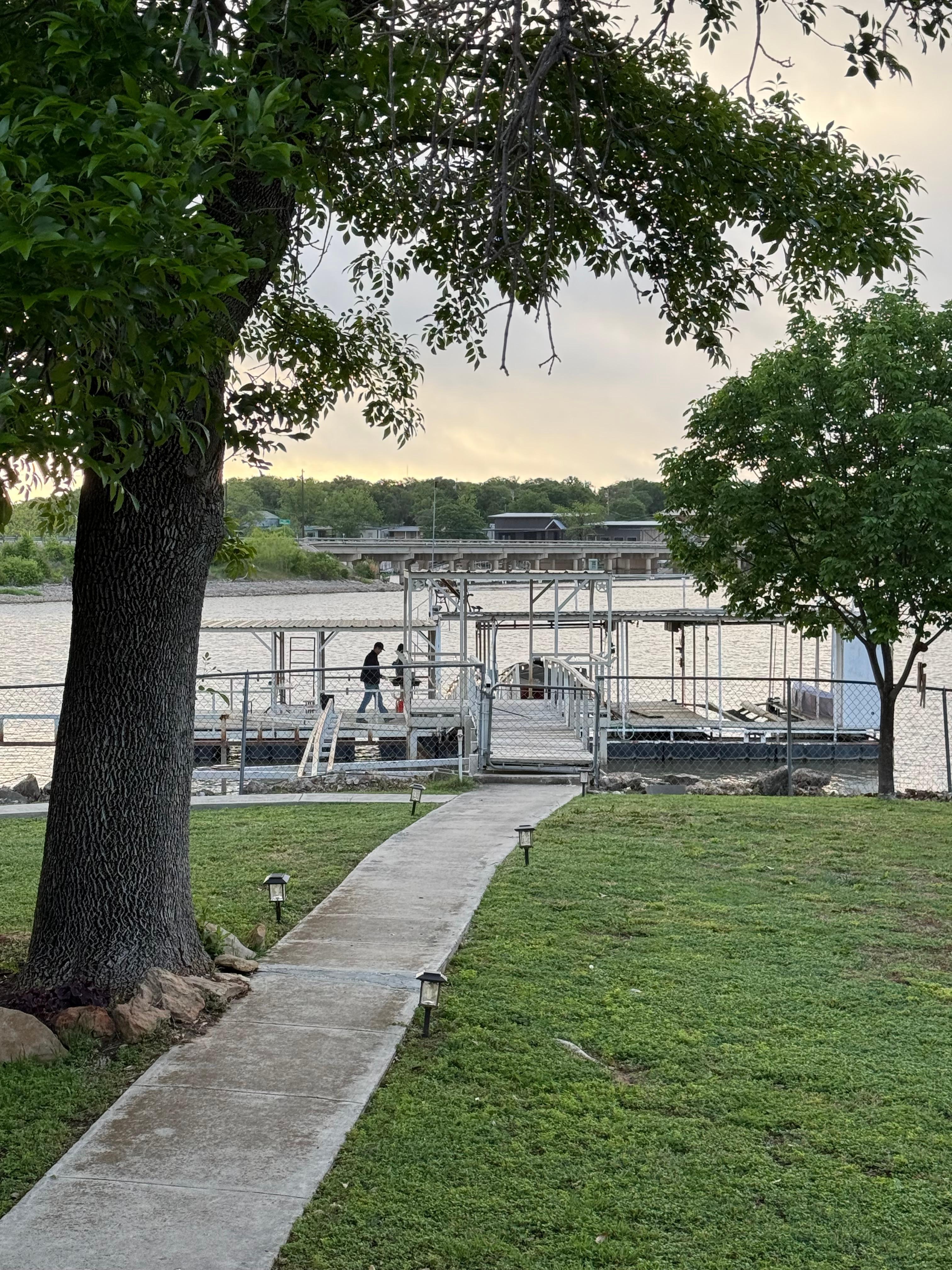 The back patio of the house overlooks the lake and is very scenic, especially during sunrise and in the evenings when the boat dock is lit up.