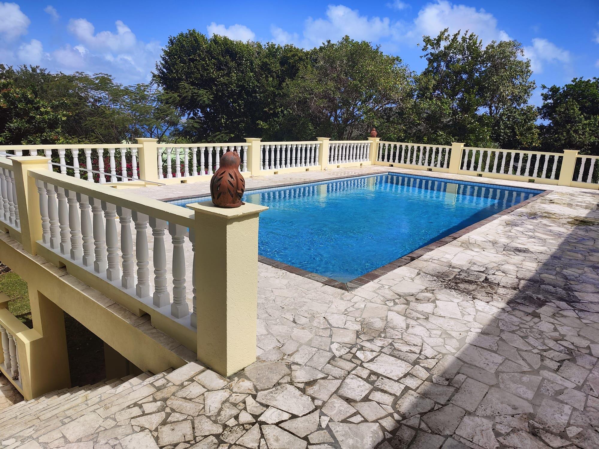 Amplia villa parte del camino hasta el Monte Nieves que ofrecen maravillosas vistas del Caribe y puestas de sol. Gran jardín con colibríes, lagartos, luciérnagas y monos. Proyectado terraza para cenar. 2 habitaciones dobles con camas tamaño queen y cuarto de baño con plato de ducha. 1 habitación con cama doble con cuarto de baño baño / ducha. Las habitaciones tienen aire acondicionado. cocina totalmente equipada, sala de estar, TV, Wi-Fi. 15 'x 30' piscina