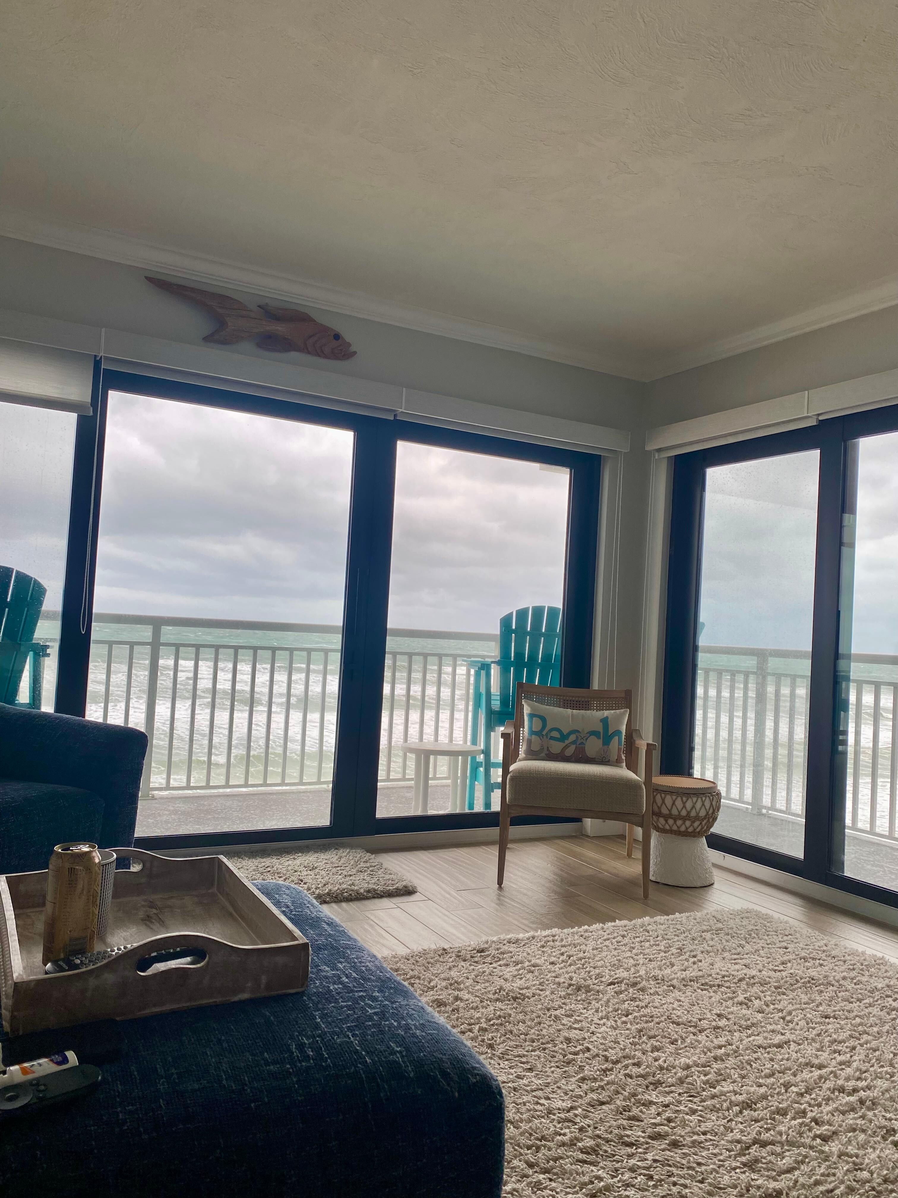 - Spacious wrap-around balcony with seating, offering stunning beach and ocean views
