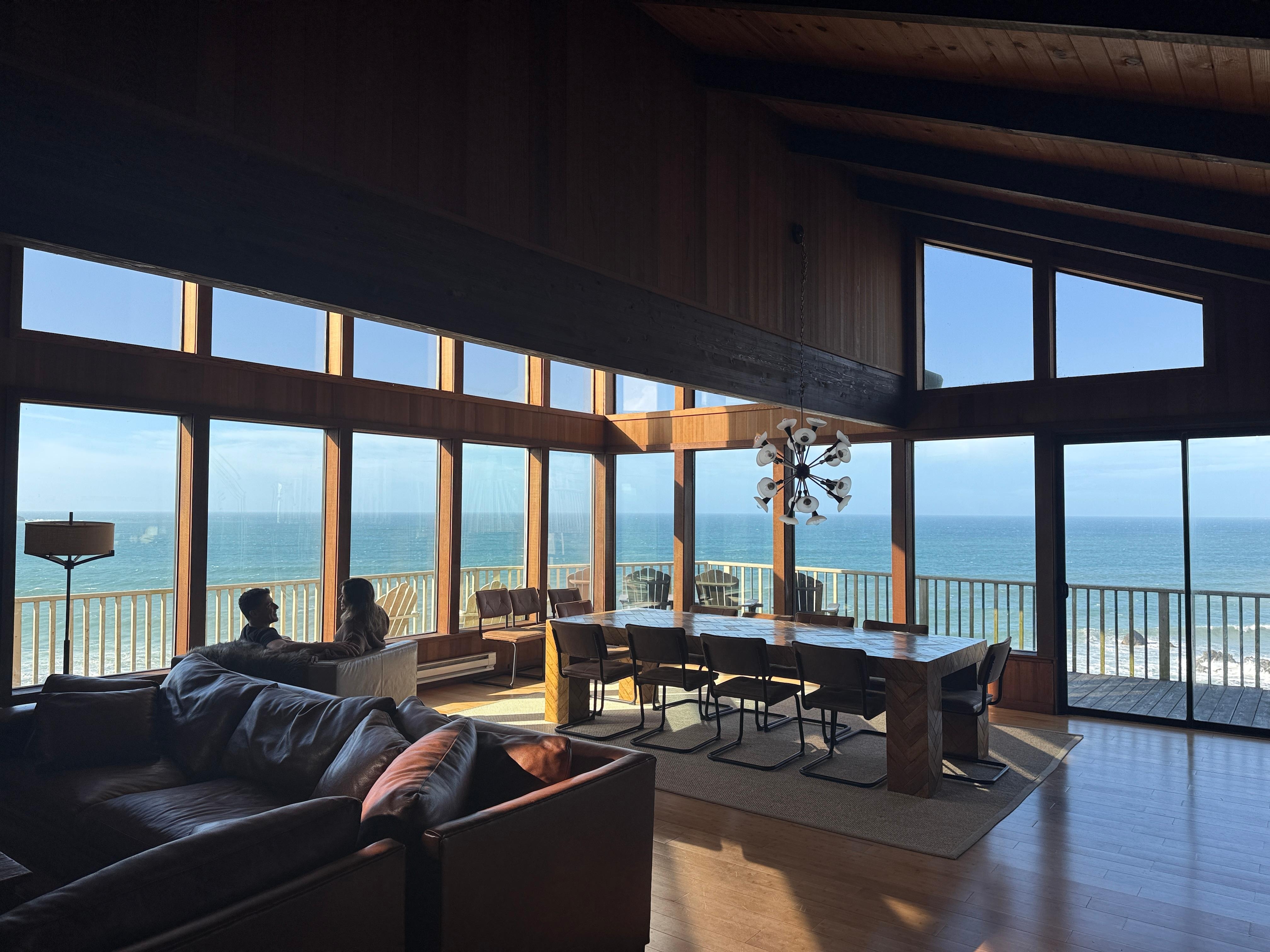 • Great Room: Spanning 800 sq ft, the great room features soaring ceilings, a cozy fireplace, and a formal dining area with seating for 14. Large windows frame incredible ocean vistas.