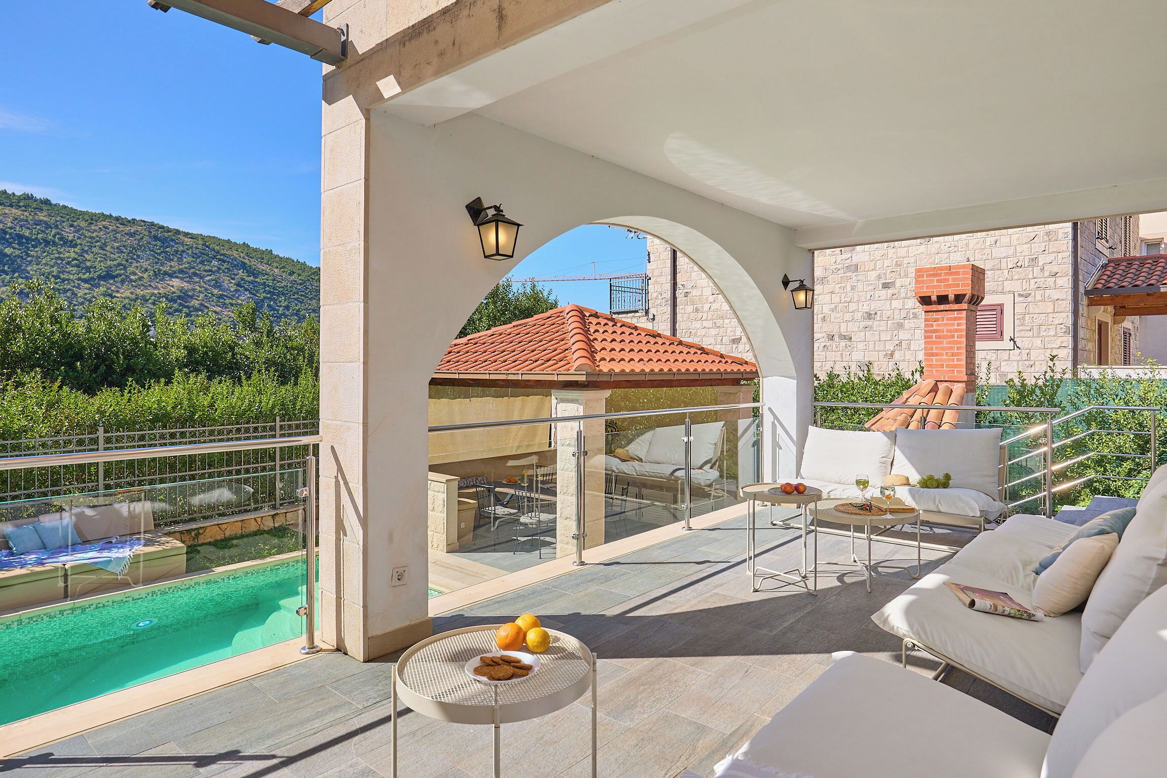 Holiday house Stone bliss is a breathtaking stone villa that combines the rich heritage of traditional Dalmatian architecture with modern luxury, offering the perfect escape on the Adriatic coast. Set on a spacious 450 m² parcel, this villa provides both tranquility and convenience, located just a short stroll from pristine beaches with crystal-clear waters. With 230 m² of beautifully crafted interior space, the villa features 4 elegantly designed bedrooms, each with luxurious king-size beds (180x200 cm) for maximum comfort. The villa offers five bathrooms, four of which are equipped with showers and one with a luxurious bathtub, ensuring plenty of space and comfort for all guests. The villa boasts a sleek, fully equipped modern kitchen, ideal for those who love to cook or simply enjoy the luxury of a home-cooked meal. The sleek kitchen opens up to a spacious dining area, perfect for gathering with family and friends. The large dining table invites you to enjoy meals together, whether it's a casual breakfast or a gourmet dinner, with ample space for everyone to feel comfortable. Outside, a private 30 m² swimming pool awaits, surrounded by a beautifully landscaped garden, where you can lounge under the Mediterranean sun or take a refreshing dip. For those who like to stay active, Holiday house Stone bliss also offers a fully equipped gym. After a workout, unwind in the villa’s soothing sauna, designed to rejuvenate your body and mind. Whether you’re looking to explore the nearby beaches, enjoy the cultural richness of the region, or relax in the luxury of this stunning villa, Holiday house Stone bliss offers the perfect blend of traditional charm, modern amenities, and coastal elegance. Here, your dream vacation becomes reality.