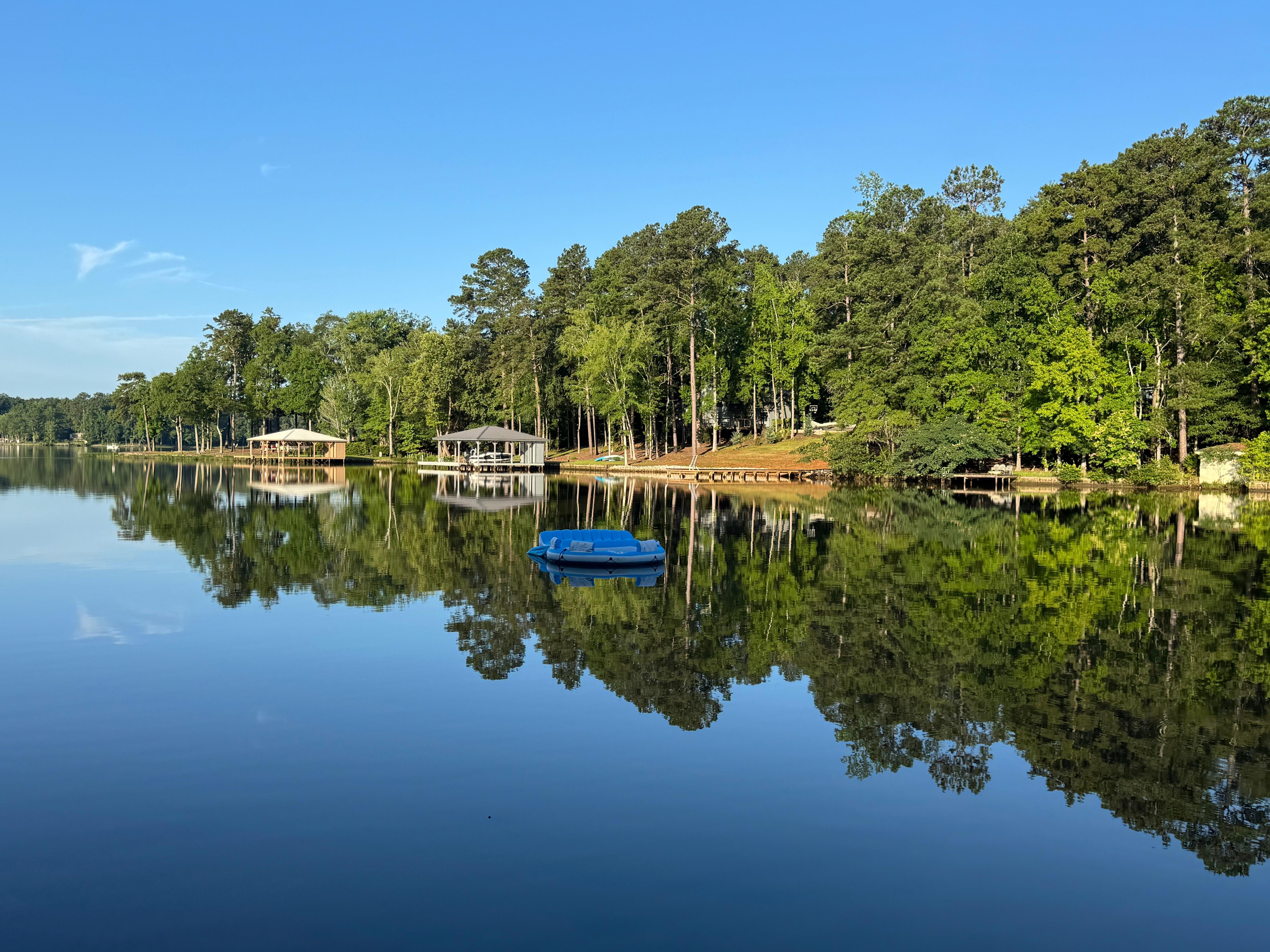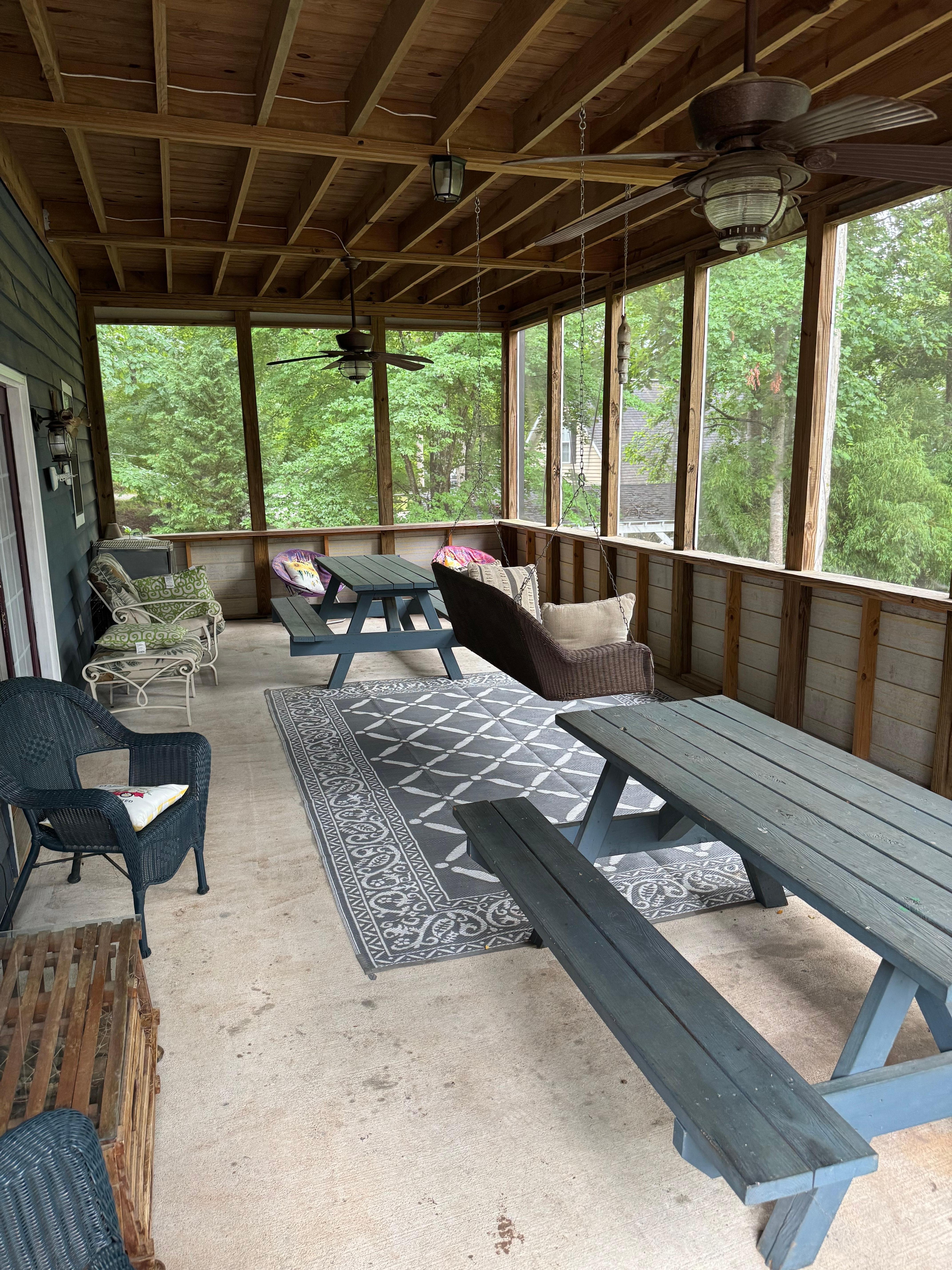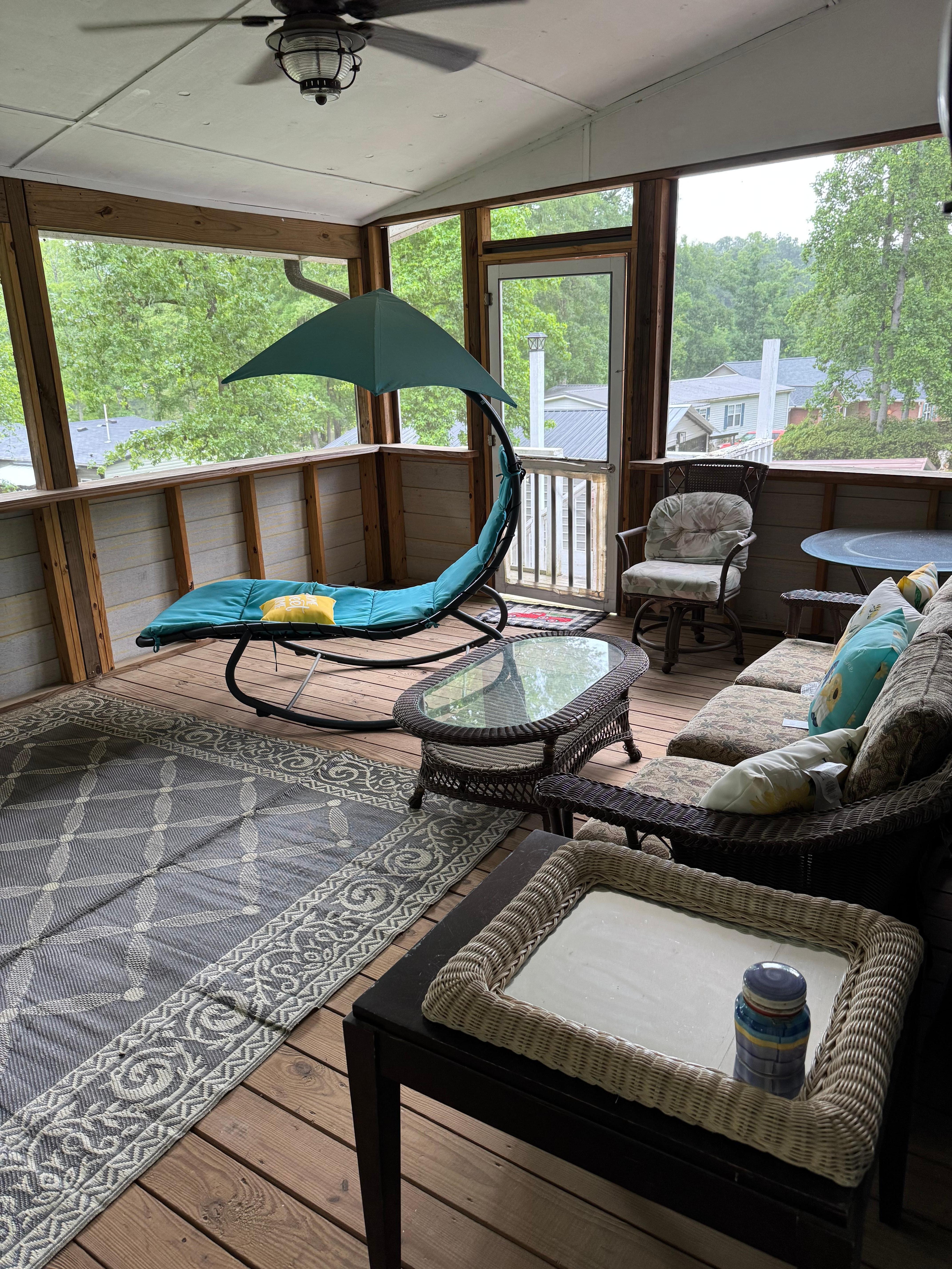 This house is a gem, with 3 bedrooms, two baths, an upstairs and down stairs screened in porch, I love to get up early and just sit outside with a cup of coffee, listen to the birds sing, squirrels jumping from tree to tree. while fish are jumping in the lake. very peaceful, quiet, and at the end of a cove, which means no boat traffic