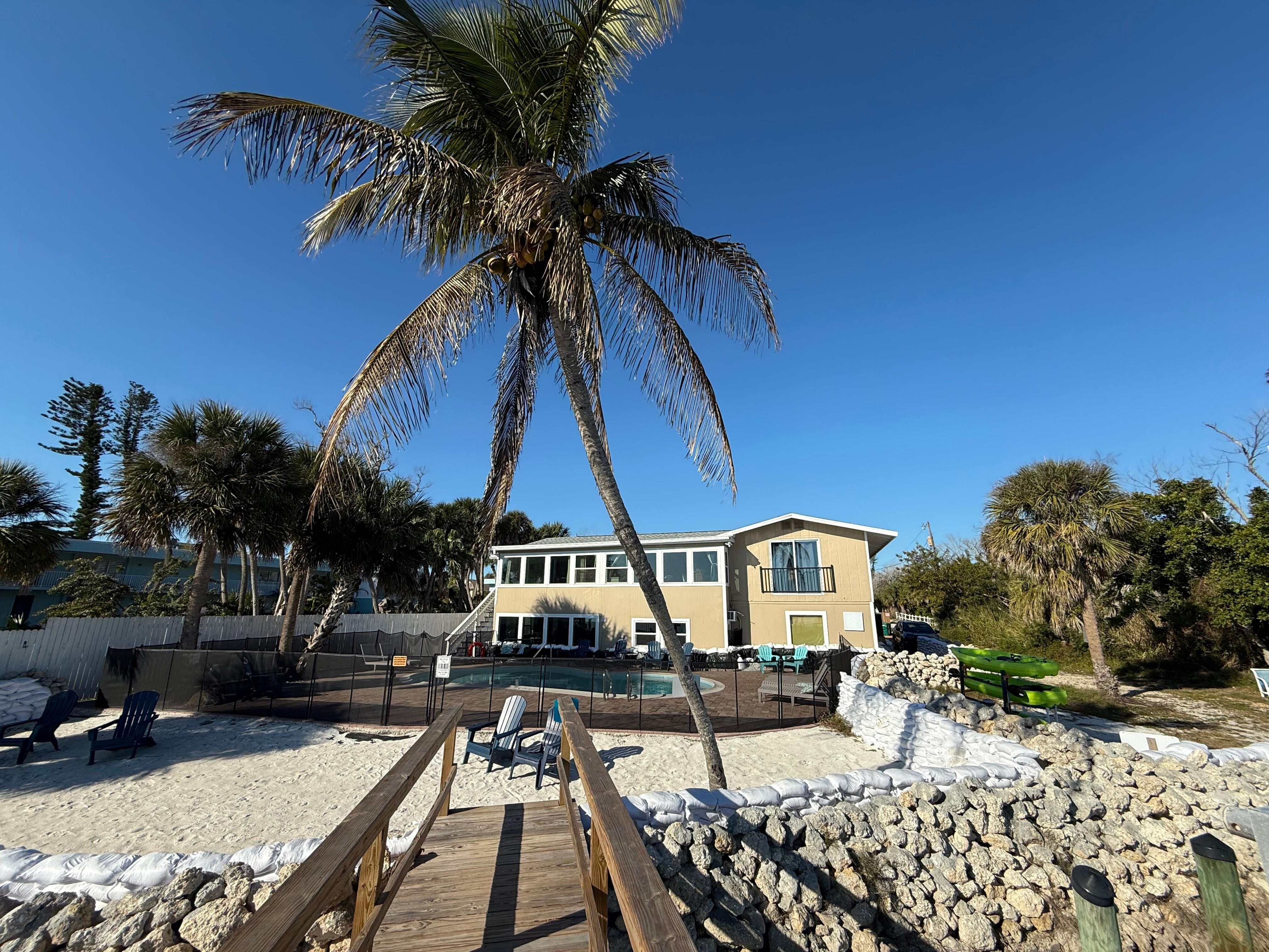 Spectacular Lemon Bay views! Upstairs at Blue Island Inn, waterfront “Bella Vista” with Bay & Pool views! 2 bedrooms; kitchen & family room. Enjoy “Lemon Bay-front beach” in backyard. Low-key quiet vacationers. 1 car parking spot. No visitor parking. Free 2 kayaks. Login to your favorite streaming services with Smart TVs. Beautiful Blind Pass Beach, Englewood Beach, 5 restaurants & Tiki Bars are just 1.5 mile away or hop on Stumpy's Free Shuttle (tip based)