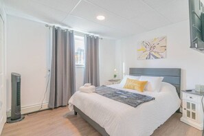 Perfect for the traveling business individual, couple or co-workers. The whole group will enjoy easy access to everything from this centrally located place. Within walking distance to the Carlson Center Arena, Baseball Fields, Movie Theater and many Restaurants. Funcionality meets modern charm in this spacious 1 bedroom apartment. There is a queen bed in the bedroom and the sofa pulls out with additional sleeping space & storage. Hi-speed WIFI and a dedicated workspace