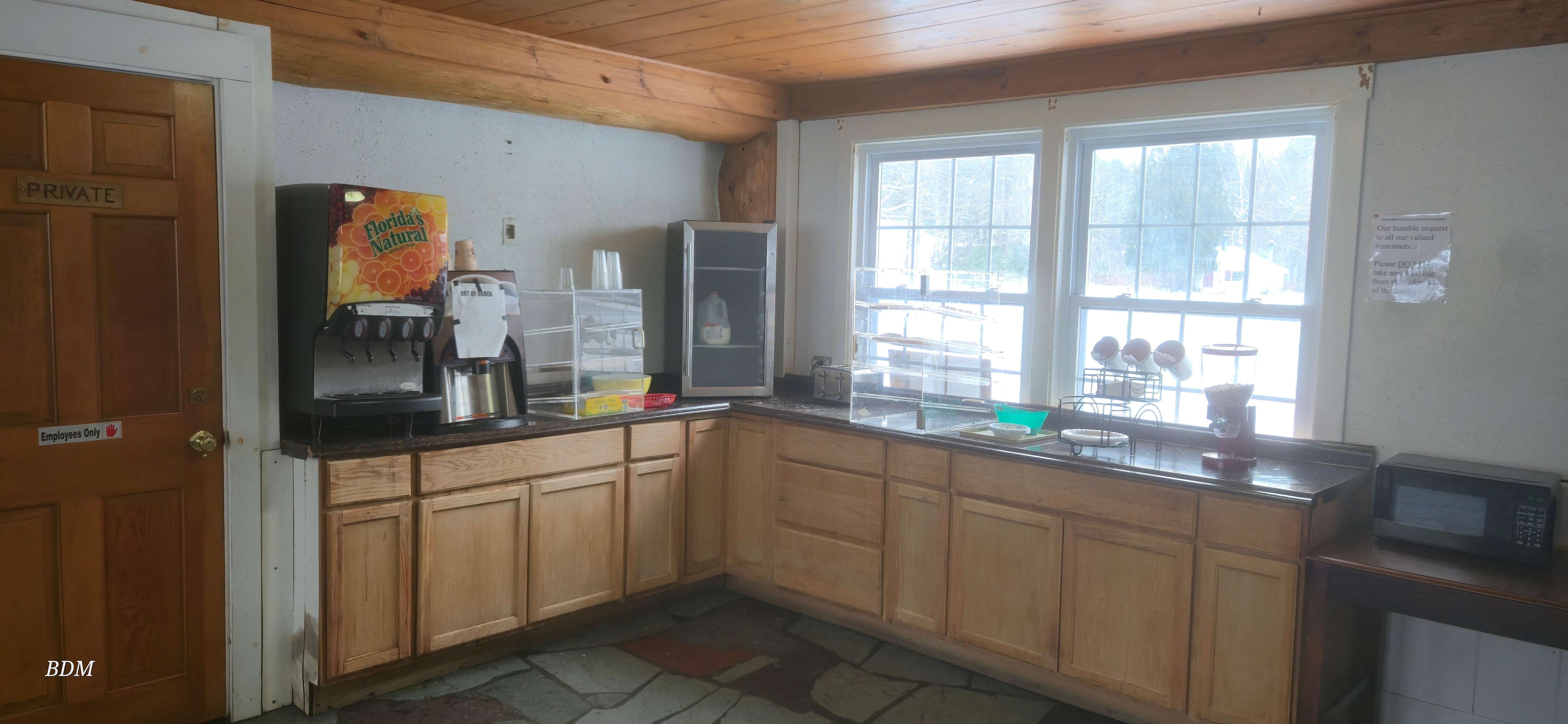 The property is poorly kept. Paont is peeling off everything. Flooring is coming up at the lodge. The paint in the room ia peeling, the floor was dirty, we found two dirty towels, the mattress xocer was dirty, the shower was dirty. There is no actual breakfast. There is BLACK MOLD in the lodge in the ceiling. I actually felt gross staying there. I have stayed at a lot of hotels, motels and lodges. I took lots of pictures.
