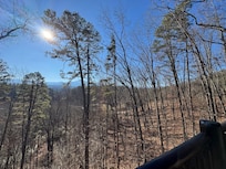 Looking out the window on the front of the cabin from the upstairs bedroom.