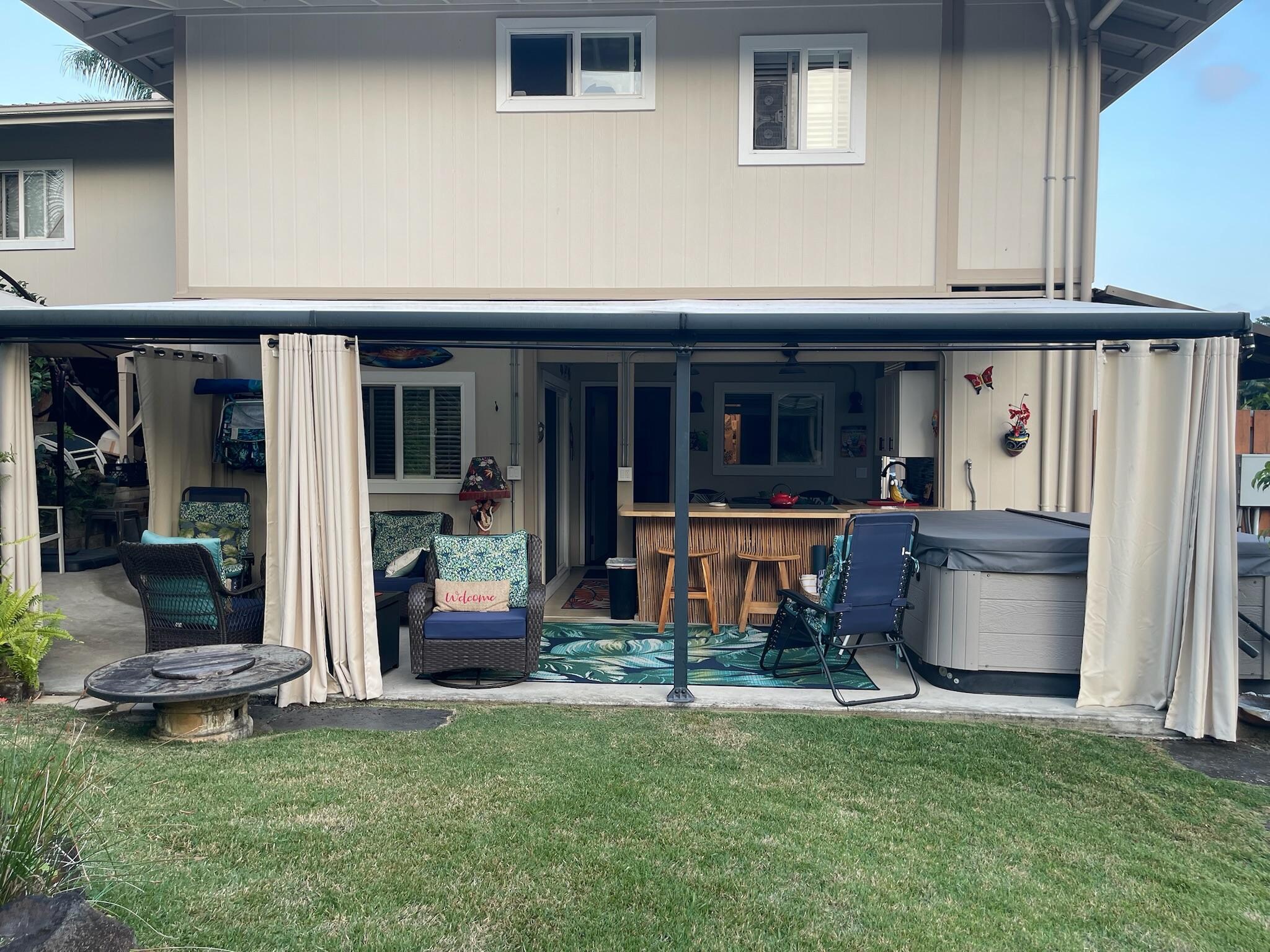 This immaculately furnished one bedroom charming Ohana unit offers comfortable indoor/outdoor living featuring full outdoor kitchen with induction cook top as well as indoor kitchenette, full size refrigerator, comfortable king size bed, private hot tub, private outdoor hot water shower, grilling area, new Samsung washer and dryer and Samsung smart TV. Located on ground level with a separate private entrance and one off street parking spot. Surrounded by beautiful tropical landscaping and a robust collection of the local bird population.