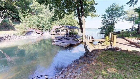 Esta casa está muy cerca del agua con escalones de piedra que conducen a un sol��rium estacionario. Barco tie-up está disponible por sólo el muelle estacionario. También encontrará una fogata, 2 kayaks para jóvenes, 2 kayaks para adultos, una canoa y una parrilla de carbón junto a la orilla del lago.