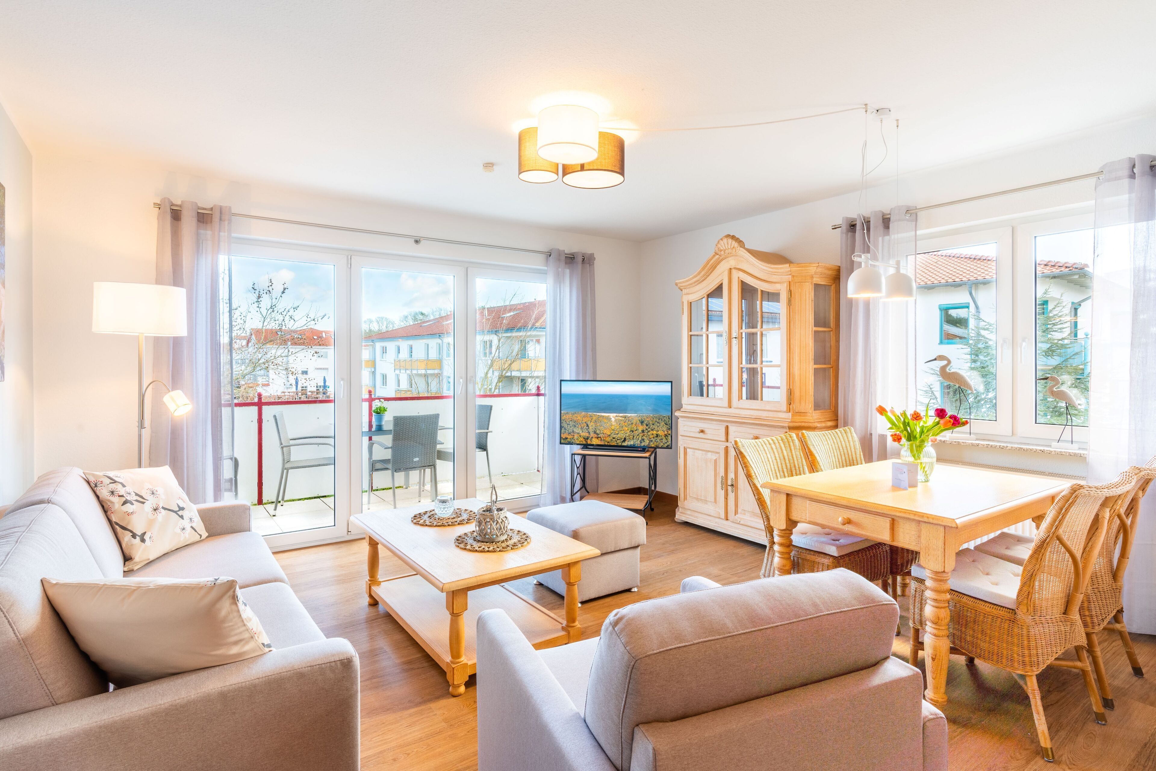 Apartment Hej!Usedom: Much white in combination with color accents in blue and sand tones give the apartment much lightness and Nordic charm. The living room and the glazed balcony invites you to linger in comfortable seating. Two bedrooms with comfortable beds guarantee you restful sleep. Large wardrobes and chests of drawers provide plenty of space for your clothes. The modern fitted kitchen is fully equipped and offers a spacious deep-freeze combination. A washing machine and drying rack are available on the balcony. The bright bathroom has a shower and toilet. You have your own free parking. In the apartment may not be smoked.