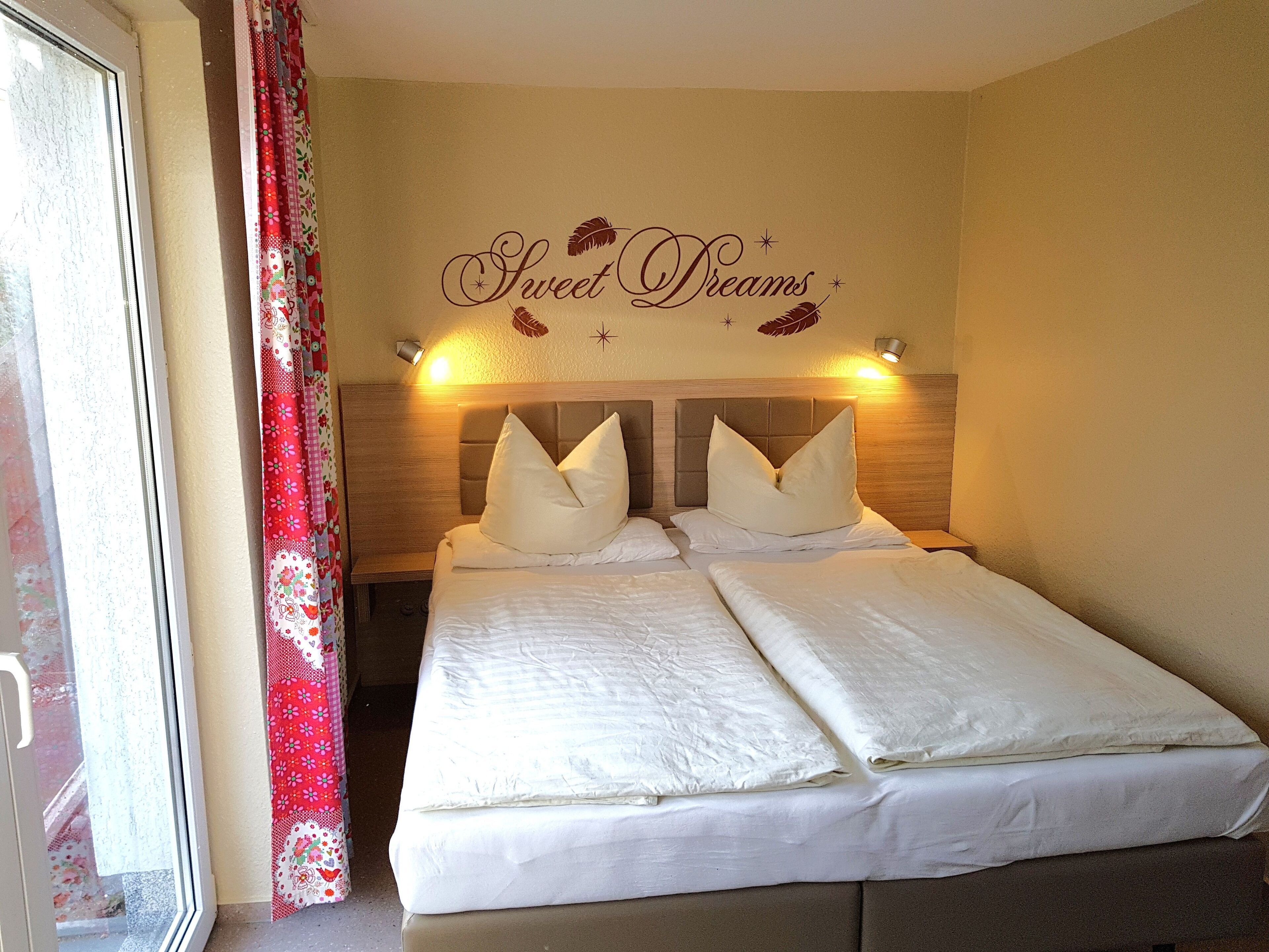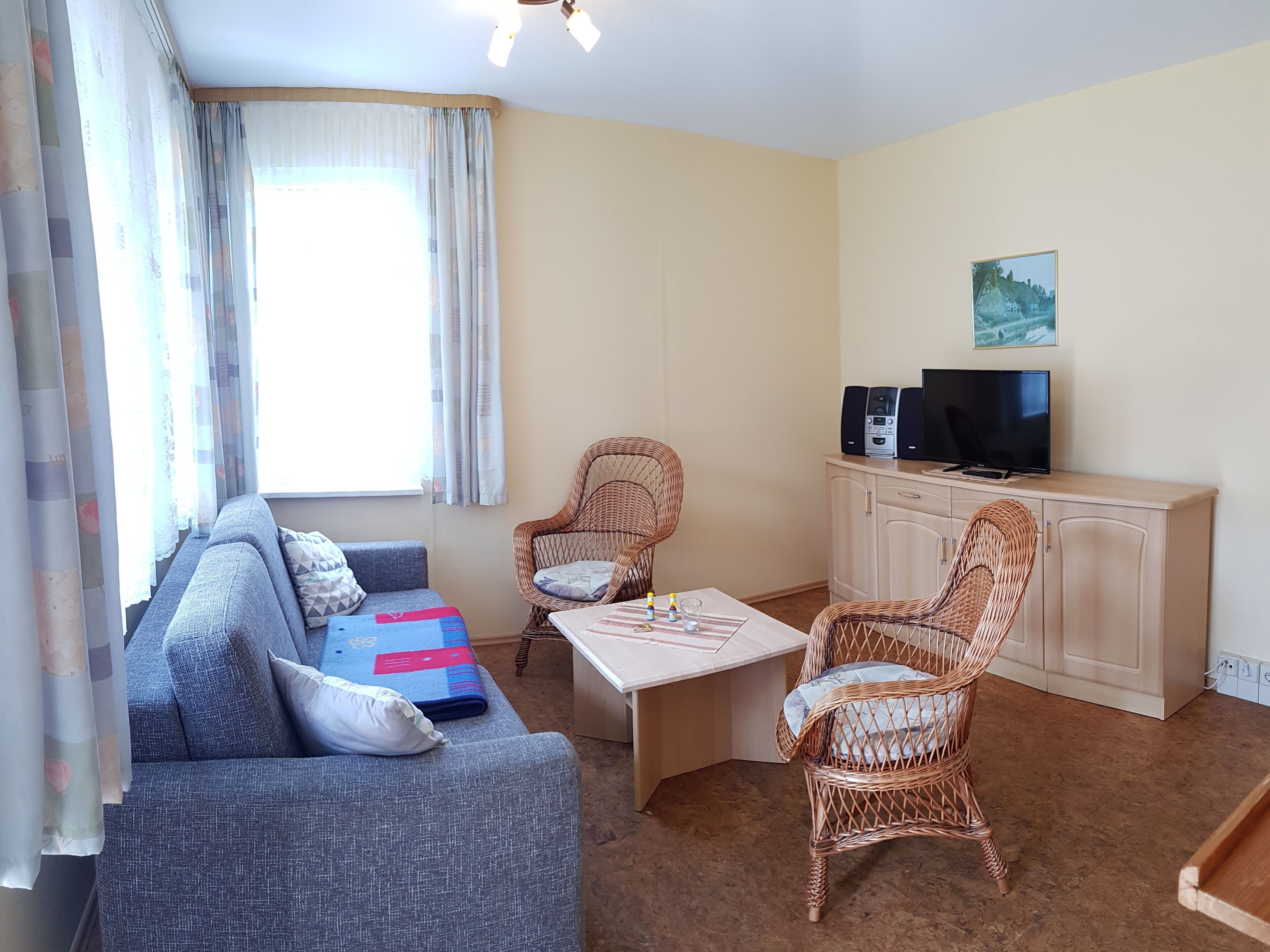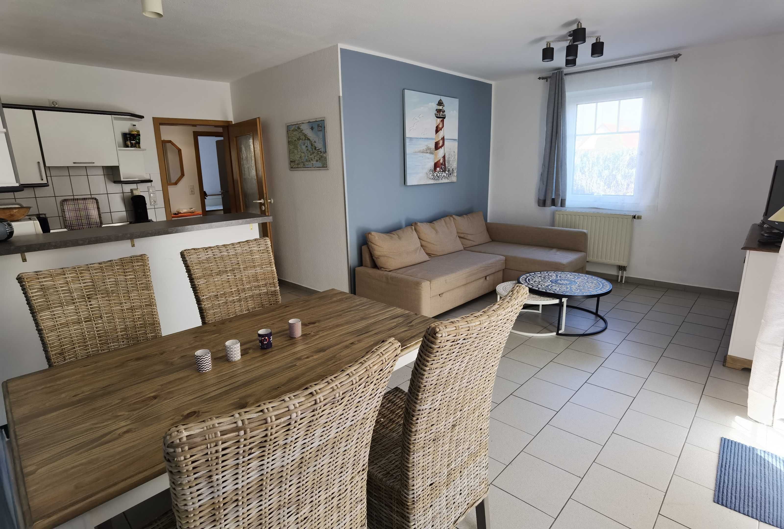 Apartment 10: You live in a fully equipped 65 m² 3-room apartment with bright furniture. The 3-room.-Apartments are designed for 4 adults and 2 children up to 12 years and have: • 1 living room • 2 bedrooms, 2 beds, 1 bunk bed in the 2nd Bedroom, • Shower / WC • Kitchen • TV • Furnished terrace, lawn for sunbathing • Parking space at the houseBed linen € 8.00 per personYou live in a fully equipped 65 m² 3-room apartment with bright furniture. The 3-room.-Apartments are designed for 4 adults and 2 children up to 12 years and have: • 1 living room • 2 bedrooms, 2 beds, 1 bunk bed in the 2nd Bedroom, 1 double bed in the 1st Bedroom • 1 bathroom with shower / toilet • complete kitchen • TV • Furnished terrace, lawn for sunbathing • Parking at the houseBed linen € 8.00 per person