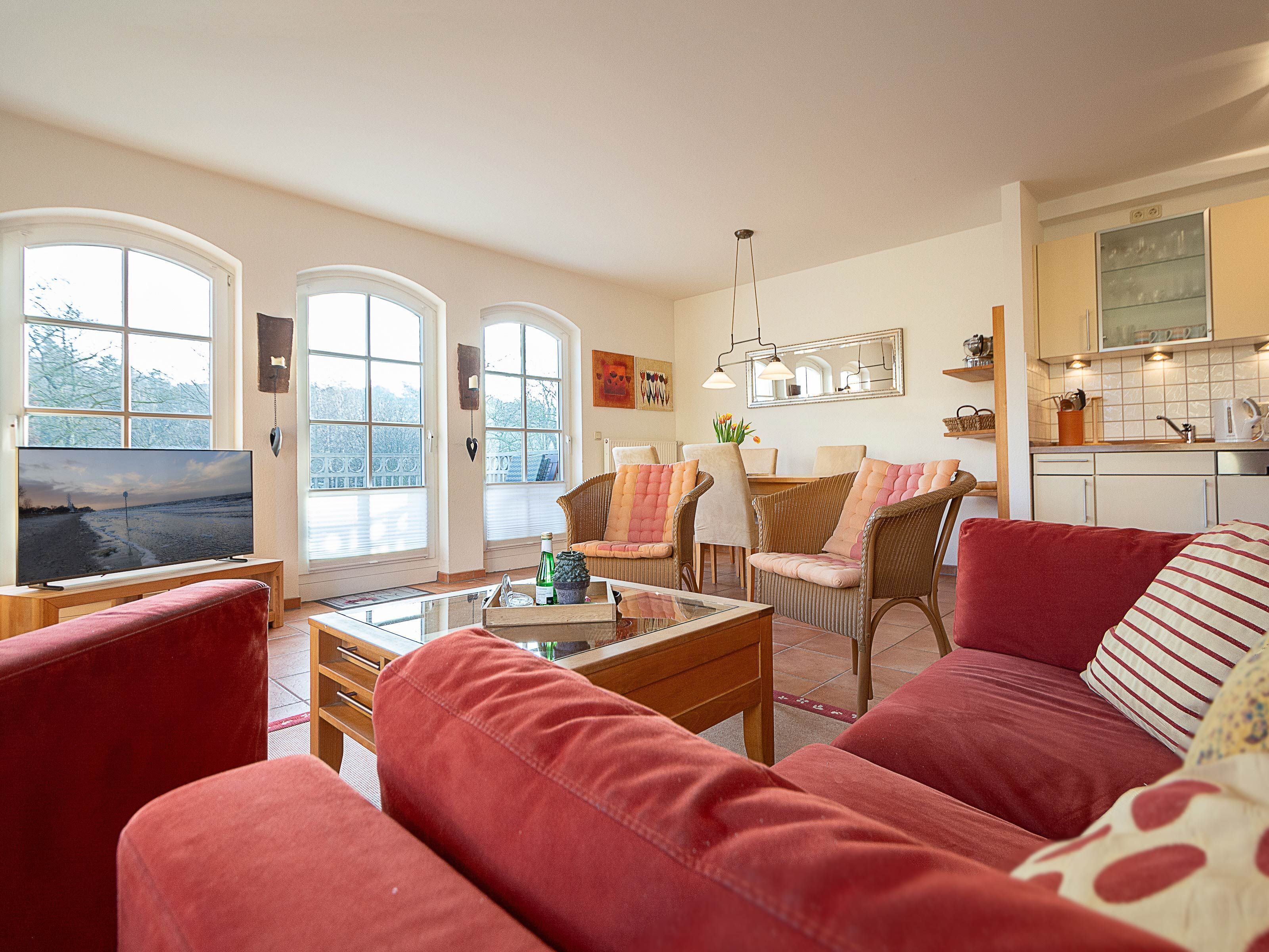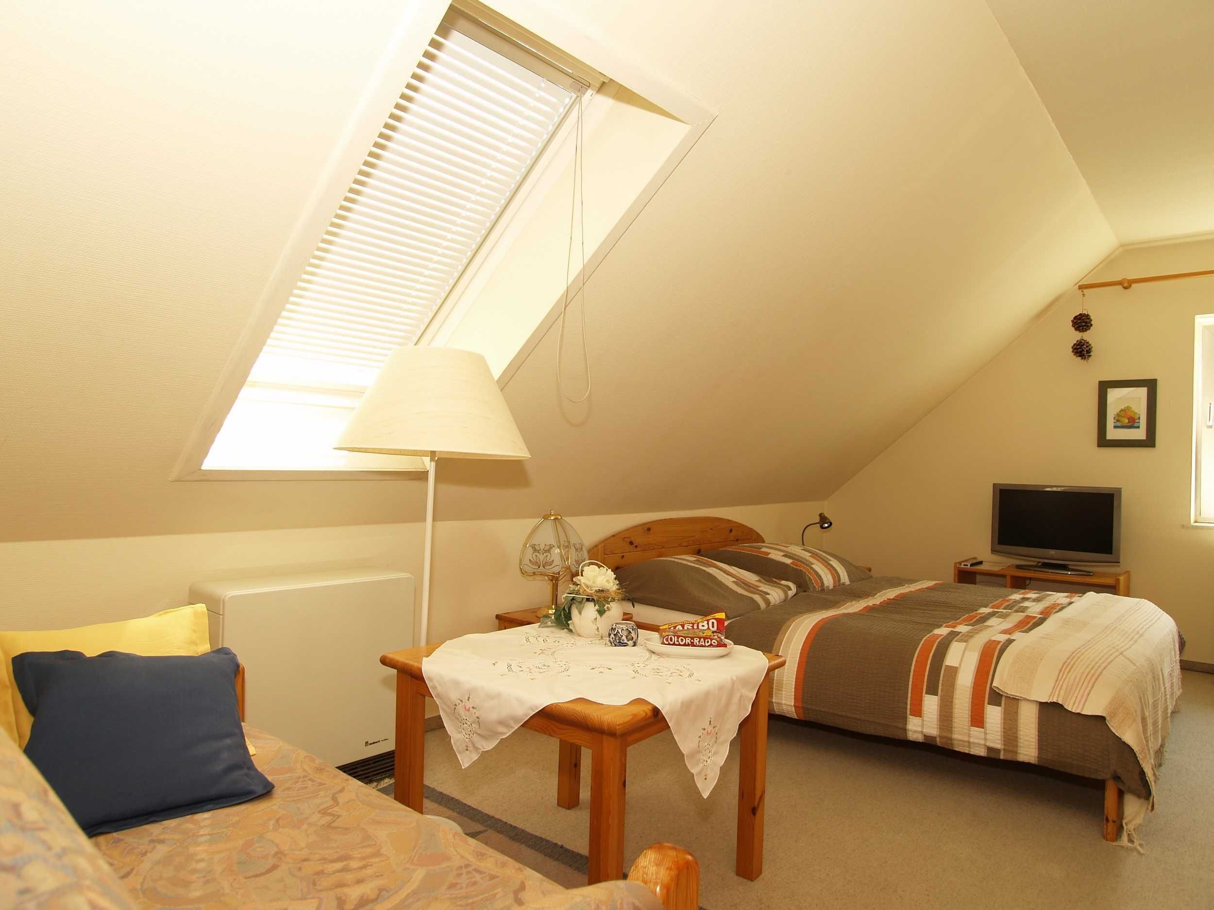 You live in a 54 m² large 3-room apartment with balcony on the top floor. The captured areas such as kitchen and bathroom have electrically openable skylights. Consequently, the apartment is flooded with light and well ventilated. For this purpose, the high ceilings contribute (3.25 m). Here it is meant that the sun shines, even when it's raining outside. The spacious living room is equipped with sofa bed and two armchairs, a dining area with chairs, TV, stereo and DVD player. The kitchenette with refrigerator, dishwasher, oven u. Stove, microwave, coffee maker, toaster, kettle, etc. located outside the living area in the upstream entrance. A room with double bed, a bedroom with 2 single beds (these can be put together as a double bed) and the floor-heated bathroom with shower, toilet and towel radiator complete the picture of this apartment. For small children is ready a highchair. Per person is a linen package as initial equipment available. An underground parking space (access height 1.95 m). From the underground car park you can easily reach the apartment via a lift. Free Wi-Fi is available throughout the apartment. Sauna, washing machine and dryer for a fee in the house.
