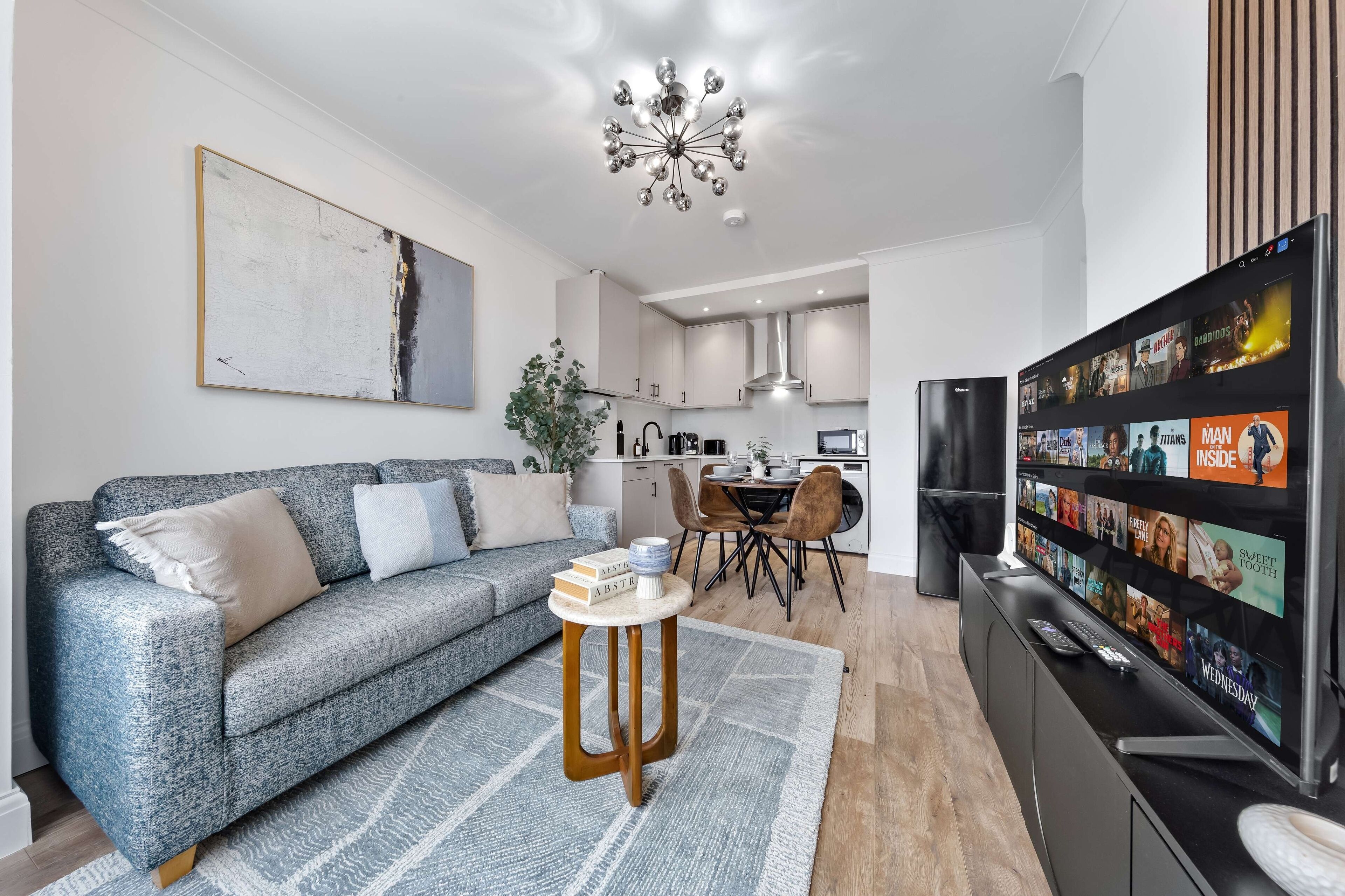 This spacious studio in North London accommodates up to 5 guests 🏡, featuring a bright open-plan layout with a cozy lounge area ☀️ and flat-screen TV 📺. The fully equipped kitchen 🍽️ is perfect for cooking, and the space is ideal for families, friends, or business travelers 💼. With easy access to shops, restaurants, and public transport 🚇, it’s a comfortable base for exploring London.
