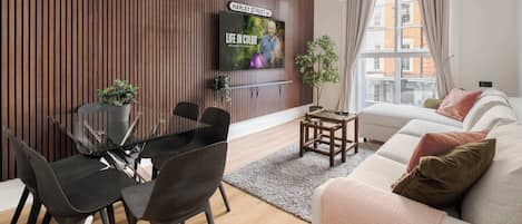 We stayed about 5 days in the middle of our trip. The apartment was exceptionally clean and the furnishings were comfortable. The location in the middle of a professional neighborhood was quiet in the evenings and nights. Transportation was easy, with a taxi stand a couple blocks away and public transport not much further. There was some light street noise during the day in the basement apartment. The washer (which is technically also a dryer), which we desperately needed at this point in our trip was adequate for washing, but drying was a bit of issue. Even with the supplied drying rack, we needed to purchase a couple of fans to get our clothes dry - a process which was far from expedient. The fans we purchased came in handy also because there is zero ventilation. Heat is supplied in-floor and despite the claims of that also giving cooling, it just wasn't so. While the days we were there had highs around 17, the apartment never fell below 22 even though we set for cooling as low as it would go. Kitchen utensils were rather spartan, but workable. Most folks never cook on vacation and there are many wonderful walkable restaurants in the area. The only other downside is that the second bedroom (and bath) is really only adequate for one person. My wife and I stayed in it because my DiL requires a tub. Were we any taller (or wider - as many Americans are) it would have been impossible for 2 and tight for 1. Two children would be fine.