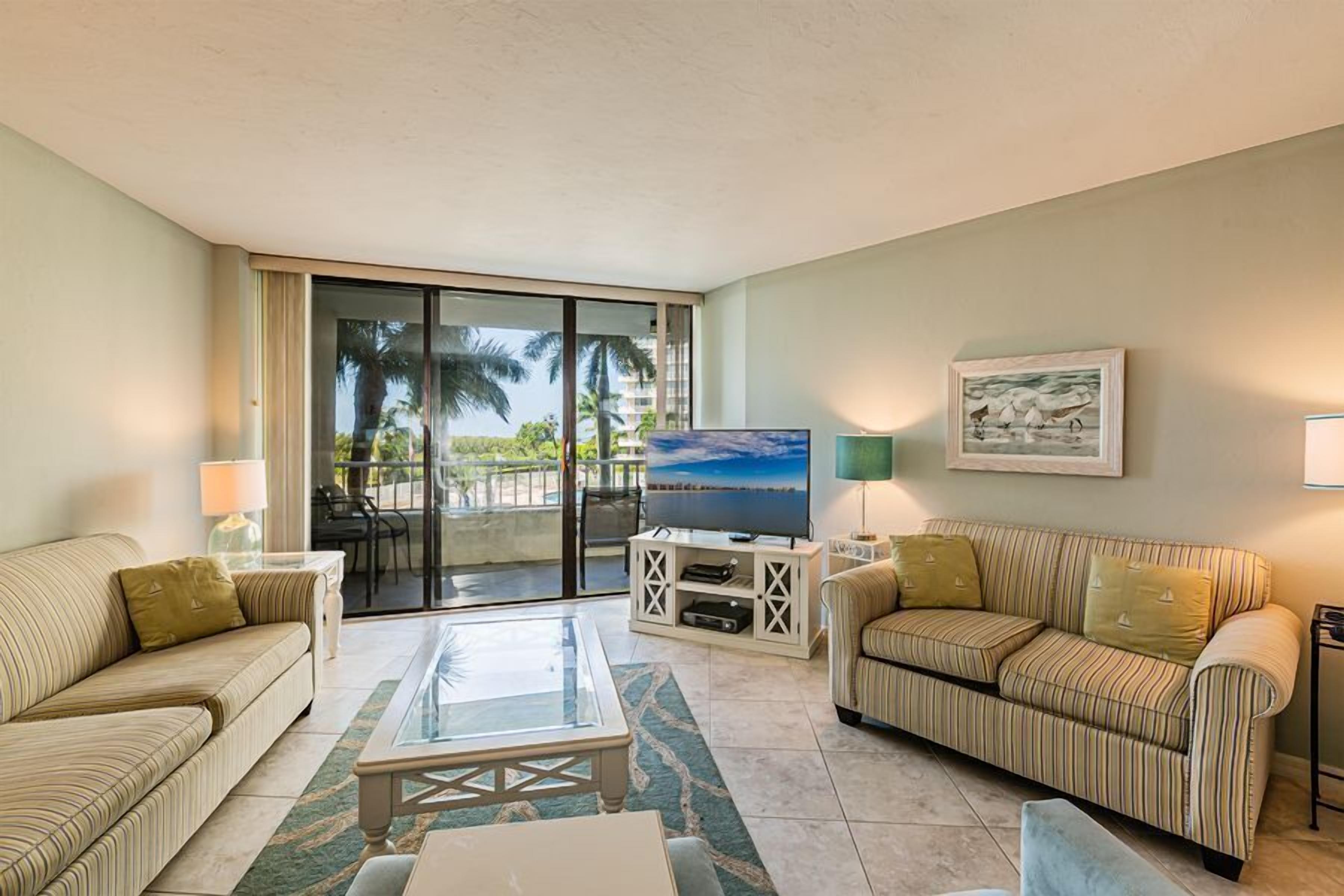 Enjoy warm Gulf breezes in this spacious three-bedroom, three-bath condo with 2,340 square feet of living space, located near the southern end of Marco Beach. The master and second bedrooms feature king beds, while the third has a queen, accommodating up to six guests.