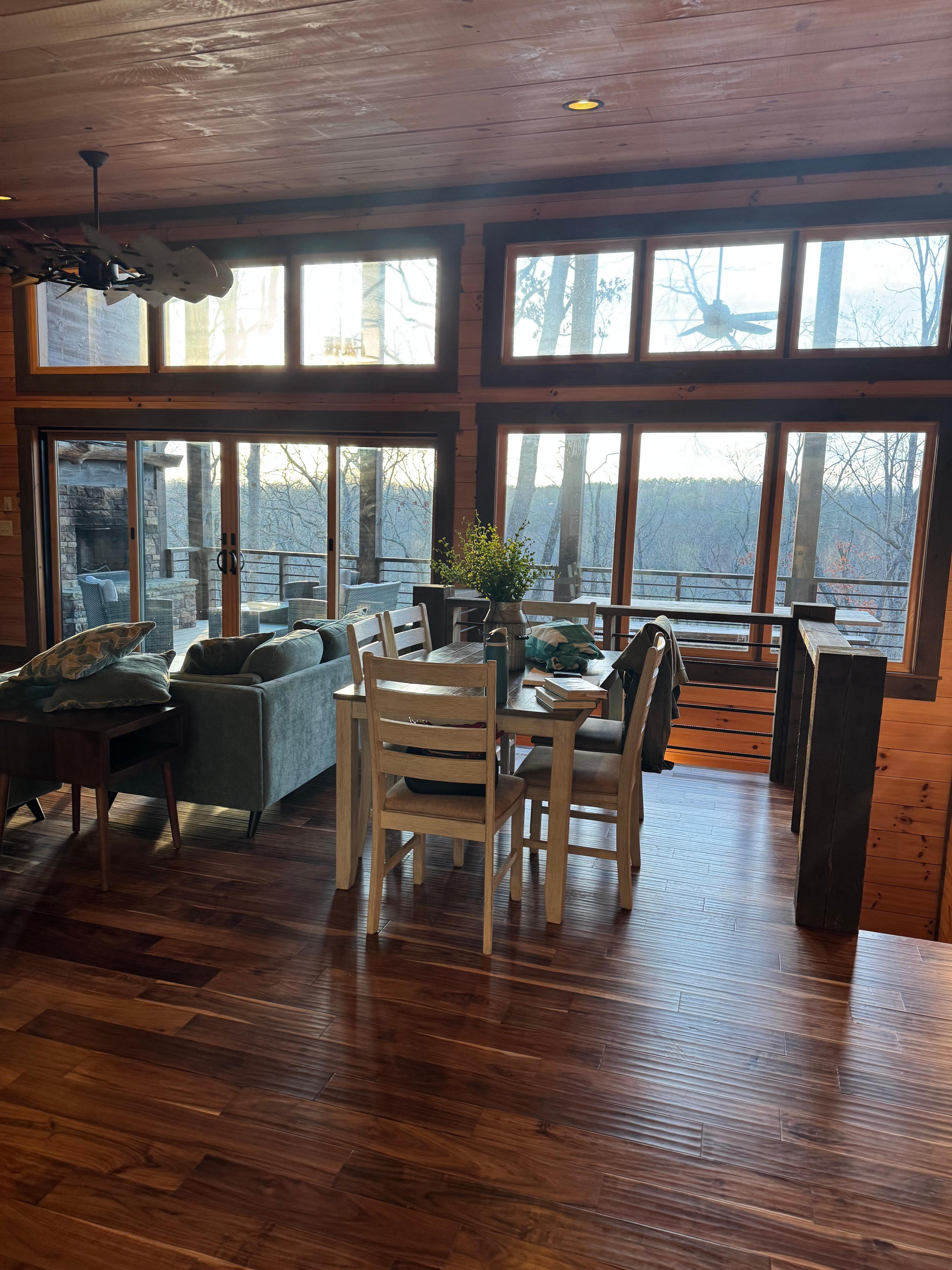 The cabin was exactly as pictured. Roomy and modern yet perfectly comfy. Very pet friendly. Deck was perfect for relaxing in the hot tub, eating outside or watching TV. Kitchen was well stocked. Lots of windows to let the sunshine in. We loved our stay and would stay here again!