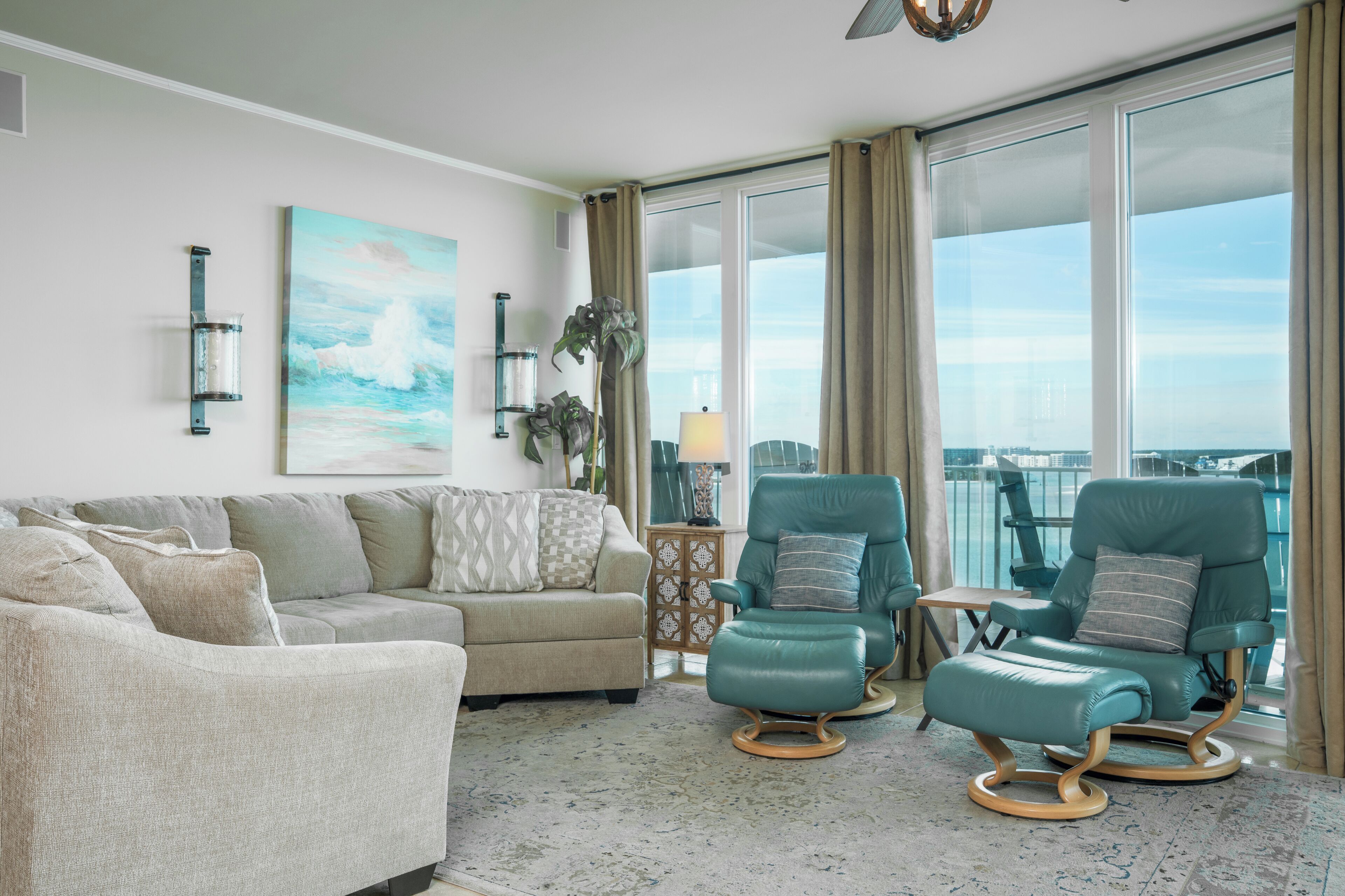 Spend quality time with your loved ones in the spacious living room featuring a comfy seating area, bright and beachy décor, floor-to-ceiling windows, a stylish wet bar, and a large TV.