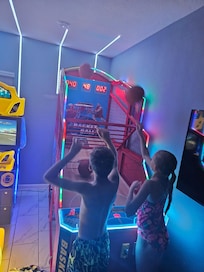 Pro:. Rooms are big. Pool fence a bonus. Bedding is very nice. ample supply of kitchen supplies. Call center very responsive and tried to fix things but some were not fixable we gave up calling as we didn't want our entire time being used to have people fixing your unit!!!!Cons: playroom equipment most items broken parts, not working, basketball not tallying, missing and cracked panels from front of pods, holes in air tables and pool table when we arrived ( we shouldn't have had any of the issues we did if proper inspections had been done prior to arrival Furniture very worn/Ripped/ holes. Chairs at dining table loose and they rocked...afraid to sit in them as they were not screwed together tightly in the backs and legs..Carpets need shampooing. Curtains,sheers and trim at sliding door were so dirty. Hair and dirt on pool bath doortrim inside. Unit next door had people out in pool Sunday afternoon that were loud and screaming and because there is no fence or shrubbery between units, we couldn't enjoy our one afternoon we were out there. Dishwasher did not appear to be worko g properly. Backhoe in back lot started working at 9am Sunday. Garbage truck was running beside house at 9pm Sunday night. Pool.service people were in the backyard at 830 Monday.(no knock on door) playground at end of street had screws missing from climbing gym that secires the chains to the ground. this unit was once very nice but lack of oversightAnd inspections has impacted enjoyability