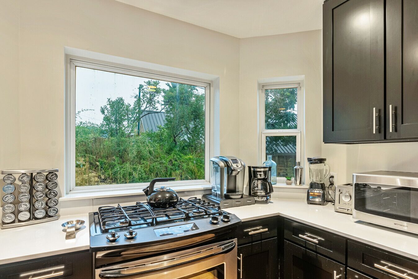 Spacious Living Room with 60 inch flat screen HD smart TV (including direct Netflix and Amazon connections through TV remote control). Cable (Comcast/Xfinity) and Wi-Fi throughout. Kitchen, with new stainless appliances, granite counters and a double Kohler sink, is fully equipped for cooking, dining and entertaining. Granite breakfast bar seats 4. Separate Dining area with oak dining table and upholstered chairs that comfortably seats 8.