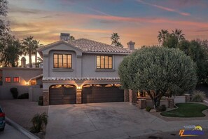 Elevate your Arizona vacation rental experience and stay at the luxurious Paradise Palms. This spectacular 4,000 square foot oasis is nestled on over a corner lot with resort-style grounds with 5 spacious bedrooms plus 2 game rooms!, 3.5 spa-like bathrooms, high-end finishes and accents throughout, an upgraded kitchen, 2 fun game rooms, heated pool (costs extra), heated spa, complimentary concierge service, and so much more.