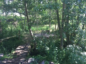 Above the stables there is a self contained apartment (sleeps 2/4 persons) large open plan L shaped sitting room with one single bed and bedroom area with one double bed and one single bed. The large sitting room has beautiful views to the mill pond and surrounding countryside. The apartment is ideally set up for self catering with a kitchen/dining room with washing machine refrigerator, electric hob, electric oven and microwave. All kitchen utensils cooking equipment and crockery are available. In the outside area there is a sitting/eating area and barbecue facilities.
