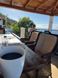 • Patio doors open to reveal the pool terrace and breathtaking ocean vistas.