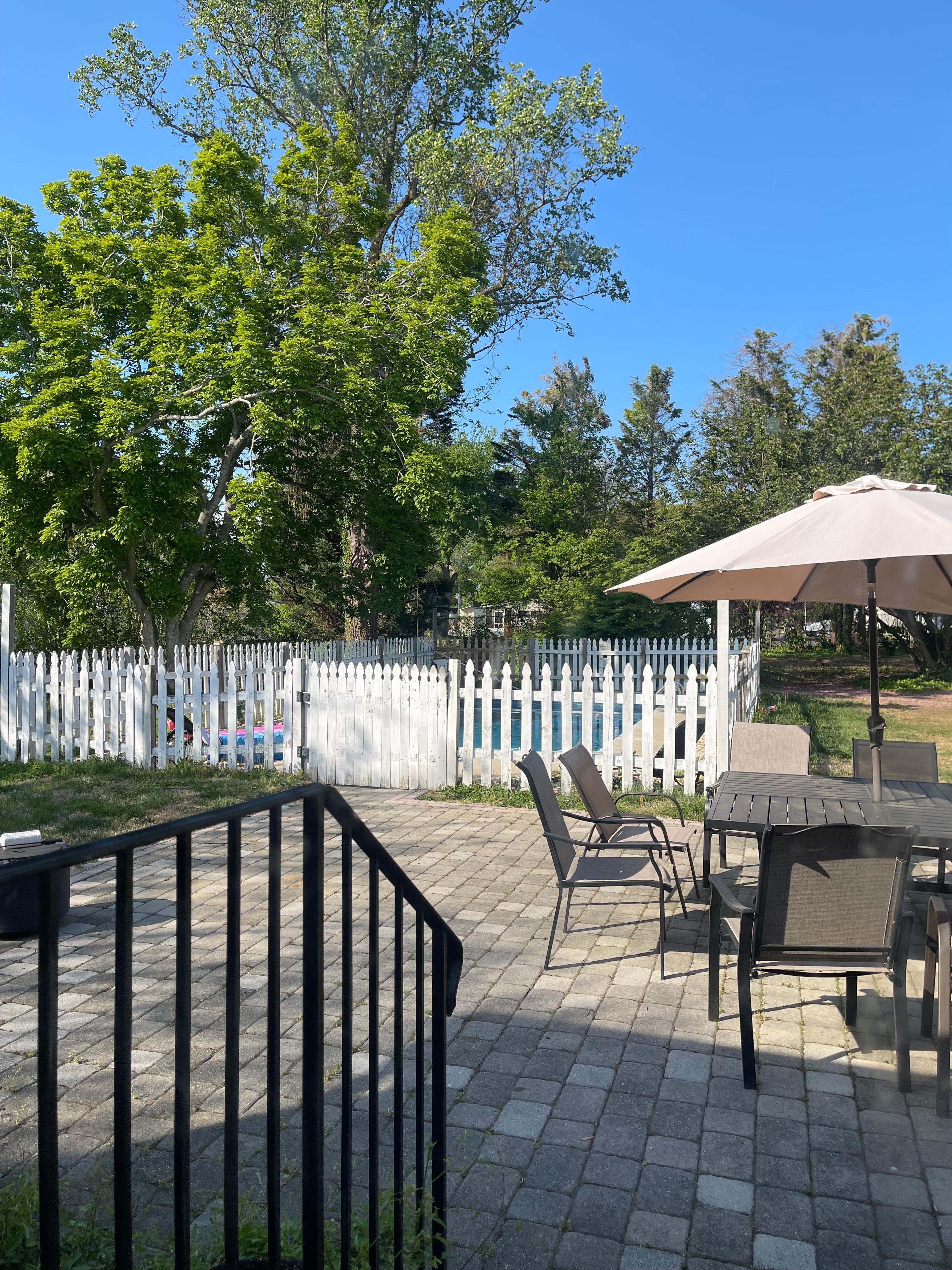 Enjoy the fenced, in-ground pool, open before Memorial and longer than Labor Day, and even longer by request. The spacious, fully fenced backyard is lined with trees for privacy and a nice balance of sun and shaded areas. There is a large patio with a grill and firepit. An enclosed outdoor shower is available after your trip to the beach.
