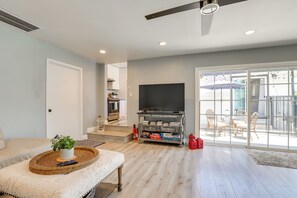 INDOOR LIVING: Flat-screen Smart TV, wood-burning fireplace (decorative only), ceiling fans, books