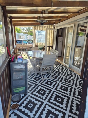 Malgré une météo défavorable, nous avons passé un bon week-end dans un mobilehome extrêmement propre et une odeur très Agréable !!! Ce mobilehome est extrêmement bien équipé, il ne manque rien: vaisselle, couvert, hachoir, électrique, mixeur, couteau de cuisine etc .. Rien n’a été oublié Tout a été prévu pour vous puissiez vous sentir comme chez vous et cuisiner comme à la maison Les literie sont de bonne qualité le chauffe-eau à gaz, permet de ne jamais manquer d’eau chaude même à huit Le chauffage de terrasse nous a permis de manger dehors, car pour huit personnes c’est un peu juste à l’intérieur. Seul, petit bémol un des côtés de la terrasse n’était pas fermé et laissait rentrer le froid ! Nous avons dû le fermer par nos propres moyens, mais c’était indispensable avec cette météo Nous n’avons pas pu profiter des activités du camping, car la météo ne le permettait pas Un grand merci à Nathalie qui nous a accueilli et qui a tout fait pour que notre séjour soit agréable