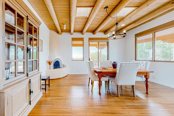 The outdoor oasis provides two large patios, an alfresco dining space, plenty of seating, and a private hot tub. Even better is the fact it overlooks the mountains and offers glorious sunset/sunrise views, all while granting you room to relax and entertain. Sip your morning coffee while gazing upon the Sandia Mountains. In the evening, fire up the gas grill and dine alfresco on the patio. When the sun goes down, behold the Sangre De Cristo Mountains from the privacy of the hot tub or as everyone sits around the firepit.