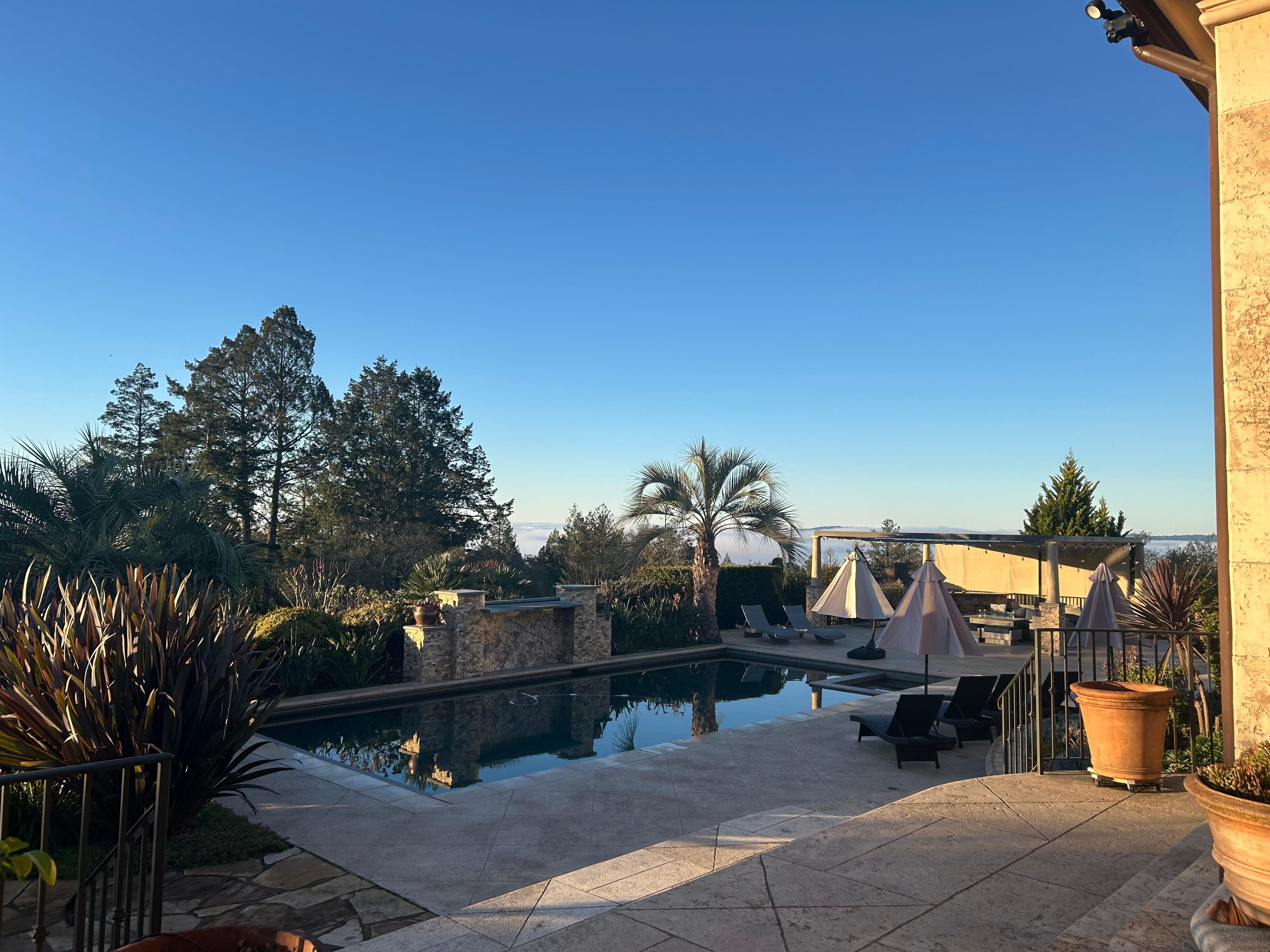 Inside, a dramatic entry, four bedrooms, four bathrooms, great room, formal dining, and an amazing view and outdoor area awaits you. Drive through the coded gate and garden adorned driveway, and park near or to the side of the front door area, where you will notice a large fountain area, yet another spot for some meditation or alone time, then enter the double doors through keyless entry and be amazed. A dramatic hallway with art from all over the world, leads to a living area that almost pulls you to the floor to ceiling windows and views beyond. To the right of the entry is a half bath and to the left area a formal dining room awaits 8 guests and perhaps a personal chef serving a meal to remember. Additionally the guest bedrooms and bathrooms are on this side of the home. Continuing ahead to the large open views area, a living room furnished with sofas, oversized chairs, large gas fireplace, and television invite conversation and gathering. Access to the pool and outdoor is available here, at the kitchen, and also the primary bedroom. To the left are a working area with desk and outlets for business or games, and a bar area supplied with a variety of glasses for beer, wine, and cocktails.