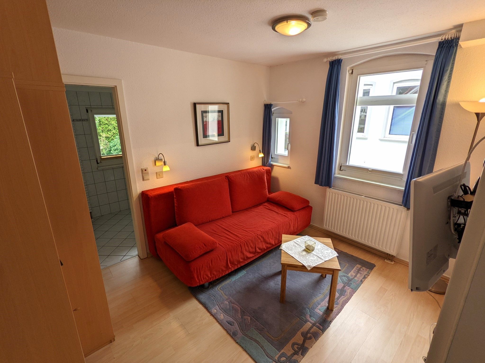 Budget room (with shared shower) 26: For families and lovers, for groups of friends or price-conscious travelers, we have spacious rooms in the first location, which are also comfortably furnished and have their own sink. The room has a double bed with bedside tables and reading lamps, a flat-screen TV and a wardrobe. The apartments are not cleaned daily, but only after departure!Fresh towels are provided on arrival and the beds are already covered with bed linen. A travel cot can be provided if required. Please indicate this when booking. The individual showers (lockable) and toilets for sharing with a few other guests are located in the hallway. Free WiFi can be used by our guests!