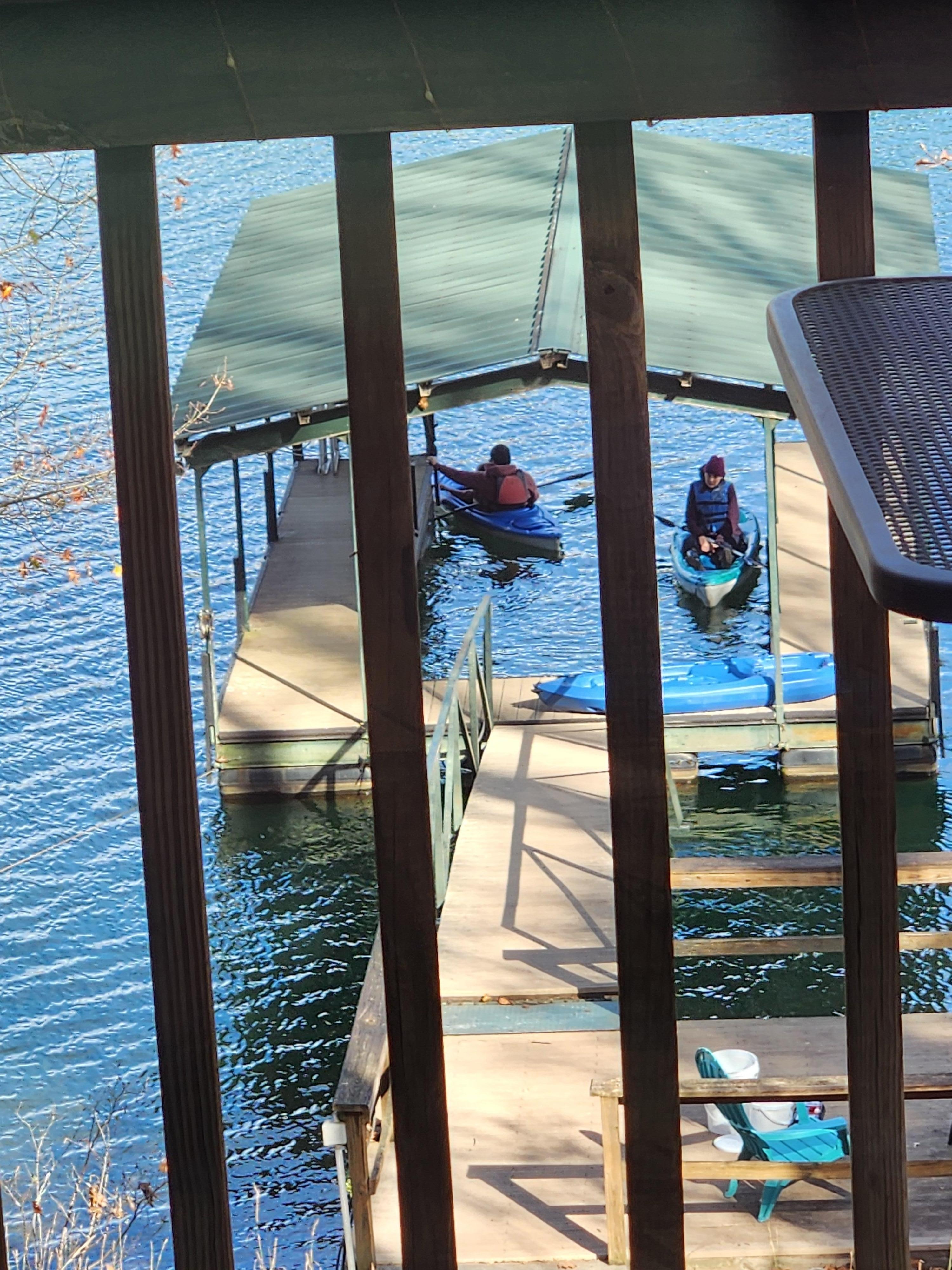 Perfect waterfront vacation for the entire family. This 4 bedroom lake home sleeps 12 and offers all the essentials for a GREAT leisurely getaway. Our home has 3 floors with two living areas and kitchens, as well as 3 bathrooms and a full laundry room. Ample parking for 4 vehicles, but could fit more. Park your boat or jet skis at the covered dock, or paddle around the lake in our 3 kayaks. Relax and sunbathe on the adjoining platform dock. In the evenings enjoy stories and s'mores with family and friends at the fire pit patio. From the lake, walk up the stone paved path to the house. The views from the upper and lower decks are peaceful and calming. The private wooded setting adds to the experience. Log in to our Wifi and relax.