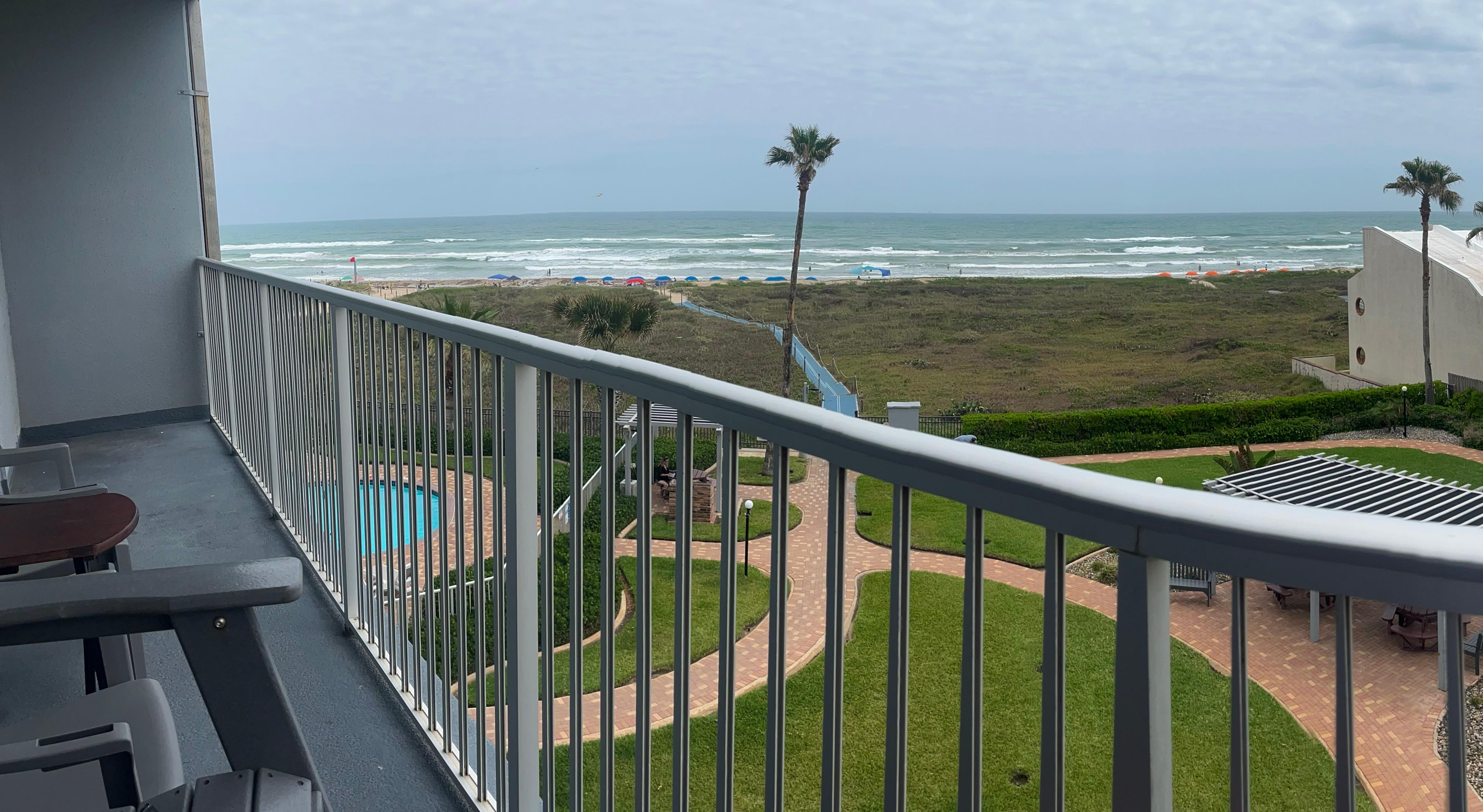 Or, I could walk a few steps onto the balcony that overlooks the ocean and see a beautiful courtyard with grills, pool and hot tub. The security gate off the courtyard takes you directly to the beach.