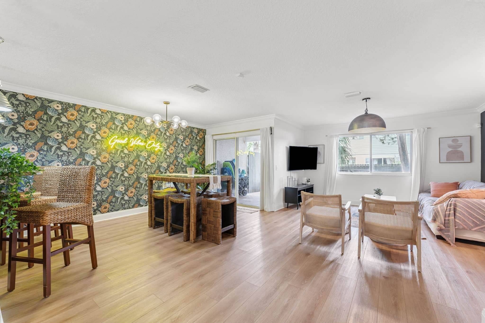 Arrived and the playset was missing. Listing was only updated after I mentioned that it was a major factor and we had really looked forward to playing with our son on it. Also this house is split into a duplex so you don't have the whole home as VRBO advertised. This is mentioned by the owner after expanding all the fine print details about the property. The hot tub was COLD and they would only let it run a few hours at a time. No guest controls on the hot tub either. Had to message the host in advance every time we wanted to use it and it took hours to heat up. There was not baseline temp either, it was cold just a few hours after each use. There is a floodlight camera near the pool that was constantly flashing off and on our entire stay- not exactly the relaxing time in the hot tub viewing stars that we've had other places. Tiny black ants were everywhere. They address this in their welcome book on the entertainment console saying it's normal in Florida to have bugs. I've lived in Jacksonville before and this isn't the norm. They were on the bedside tables, countertops, and the floor where I planned on playing with our son. Every morning woke up with them in my glass of water. Found socks and underwear from the previous renter in the dresser - gross! Master shower is nice and had room for my son to play in the water though the hot water seemed lacking in supply compared to home and ran out after 20 minutes or so. This place has potential but seemed like it was being rented before it was ready.