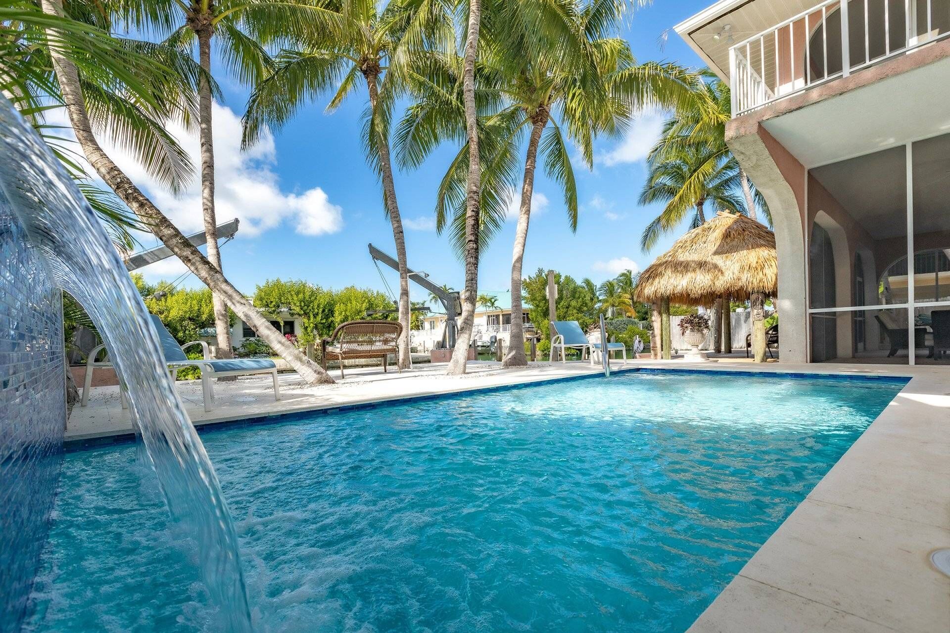 The backyard was a tropical paradise- Palm trees, hammocks, outdoor kitchen and tiki hut by the canal, a pool and bathroom. Beautiful back deck and front porch with seating areas.