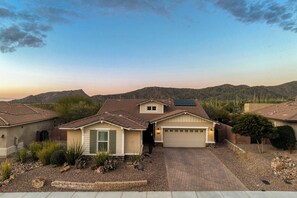 Southwestern stunner with enclosed yard, pool, putting green, & grill