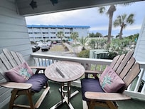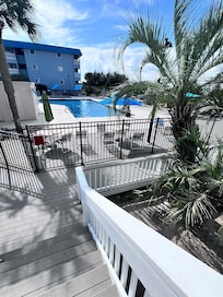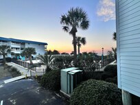 First level with ramp on far end or handful of stairs closer to the unit by the pool. Can look past a utility box unit, past the pool, past the palmetto trees, toward the ocean for a limited view. The balcony sits up above the top of car level in the parking lot. Issues with the tv working during our stay, some cosmetic fixes could be made (bathroom interior wall had primer in an area but not paint, the refrigerator had something stuck to it at some point, etc.), and we were looking forward to pulling curtains closed for sleeping on the Navy sized single bunk in the hallway like in the posting photos, but the curtain was gone. A lot of ground dirt and sand were left from previous stay that housekeeping did not pick up before our arrival. We let the owner know since they probably assume housekeeping does their job. The same with the tv, and the one travel size shampoo but lots of conditioner.Very walkable down the handful of steps to parking lot, pool, boardwalk to ocean. Bring bug spray for walking to beach and on beach as the no-see-ums are no fun after they bite. Sunsets were the best! Dishwasher, full size frige, stove top, and microwave were nice to have and the redone shower was nice! Owner was great at responding, easy to understand checkin process and code was related to my information so it was easier for me to understand, than other places we’ve stayed! The owner was great to work with. We loved the wash cloths and towels and we bought some for home!