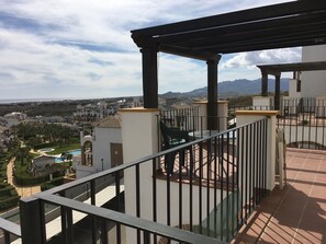 The front door opens to a lounge-dining room which itself opens onto a sun terrace with spectacular views of the coast and surrounding area. The lounge has two sofas and a comfortable easy chair with foot stool. The light, airy kitchen is well fitted with an electric hob and oven; large fridge/freezer; microwave oven; dishwasher and washing machine. The kitchen also opens onto a small back terrace which catches the evening sun. There is a twin bedroom with large, double, built-in wardrobe. A bathroom with shower. Master bedroom with double bed, en-suit shower and large, double, built-in wardrobe. The apartment has an allocated, covered, car parking space with easy access to a lift which is just a few paces from the front door to the apartment.