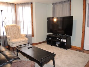 Located off of the dining room is a full bathroom with tub/shower. The first floor has 2 living rooms - each with lounging furniture and a 65" smart TV. The 2nd floor has three bedrooms and a recently renovated full bathroom with sliding glass shower.