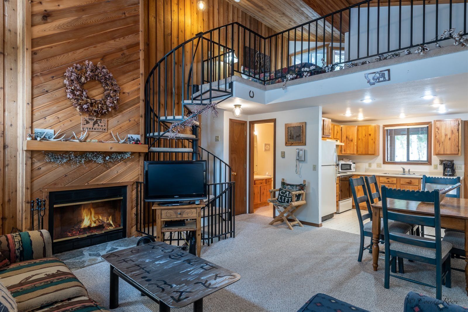 The bright living room features comfortable leather furniture, 40" flat screen TV, wood stove and small deck with views of the ski slopes. A half bath is located just off the living area. Air Conditioning units have been added for your summer comfort.