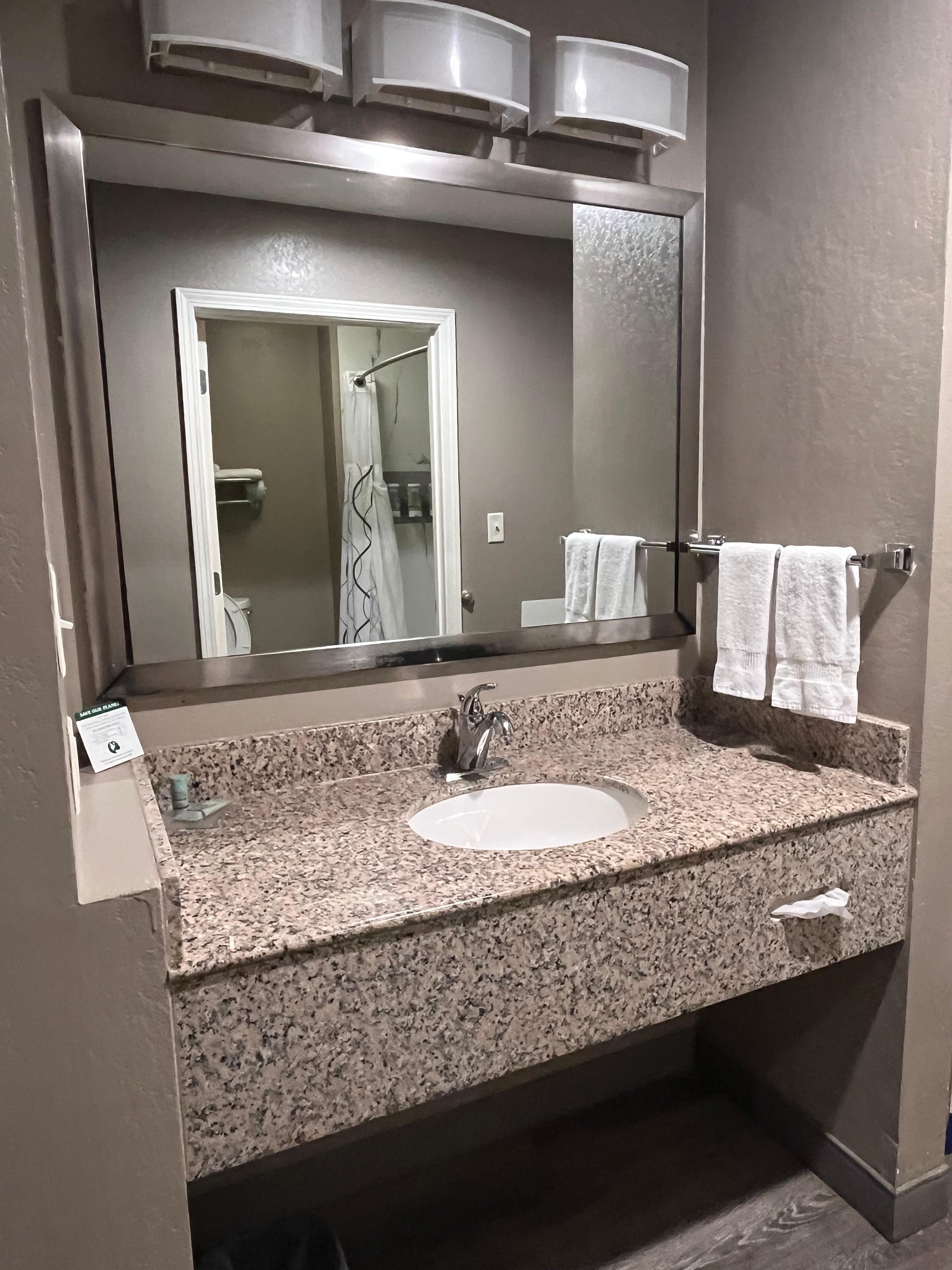 Room was clean and spacious with good amenities. Breakfast was good - bacon, eggs, biscuits and gravy, pancakes, cereal, yogurt, fruit, and other items. Very friendly staff.