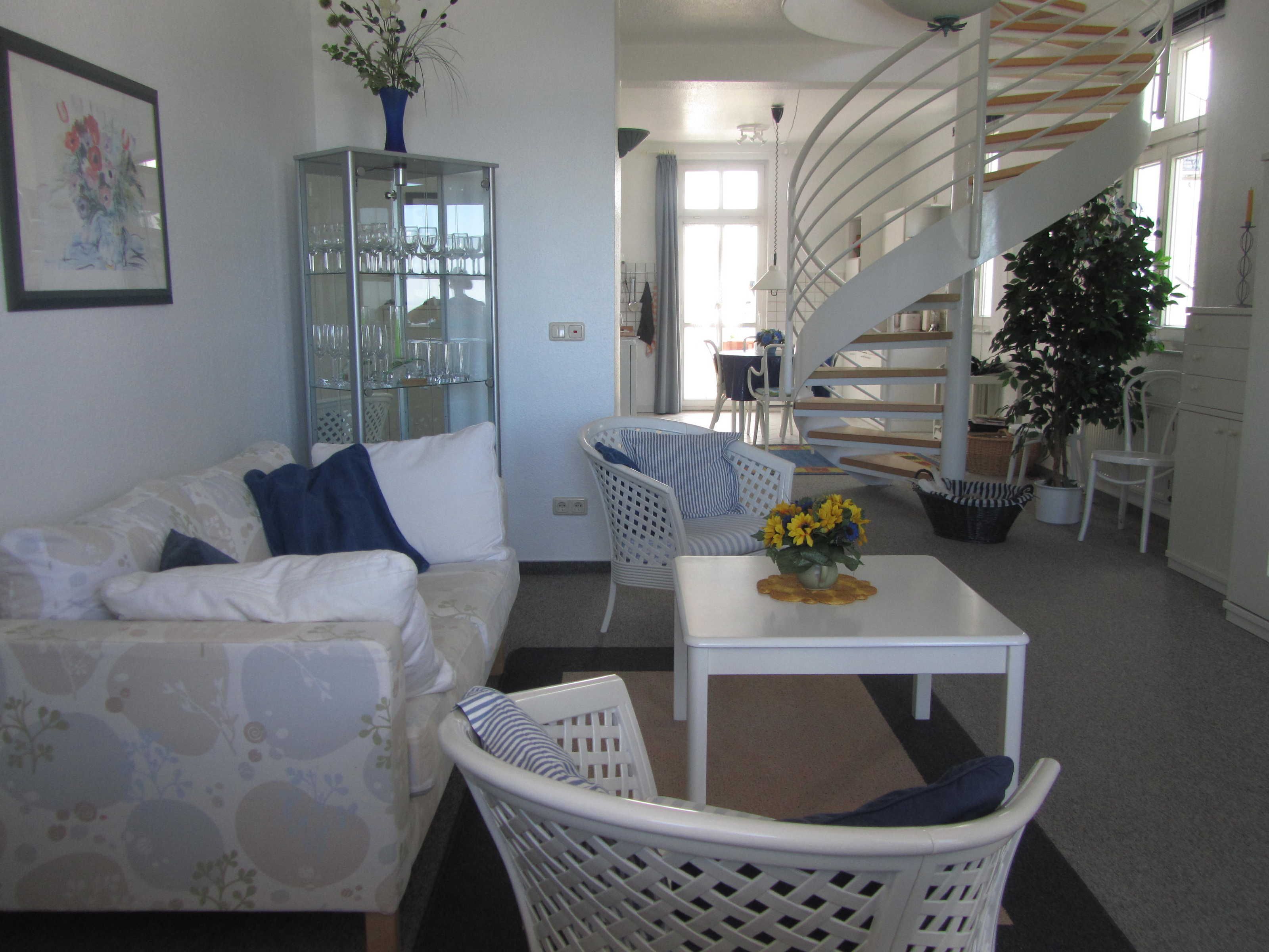 Das Erdgeschoss bietet einen Wohn-/Essbereich im Stil einer amerikanischen Küche. Die Küche besitzt sehr moderne und vor allem gepflegte Küchengeräte(Herd mit Ceranfeld, Mikrowelle, Kaffeemaschine, Wasserkocher & Toaster) und alle möglichen Utensilien, die man eben so benötigt in einem Haushalt ☺️. Das Wohnzimmer wird durch eine bequeme Couch, welche man bei schlechtem Wetter gut gebrauchen kann, geschmückt. Außerdem befindet sich ein TV Gerät, CD Spieler, Bluray Player und ein Ofen im Wohnbereich. Von diesem geht dann auch der super gut ausgestattete große Balkon ab, welcher durch einen typischen Strandkorb, einer Sitzbank und einem Tisch gute Möglichkeiten zum sitzen und Sonne tanken bietet. Alle Utensilien und Auflagen für den Balkon findet man unter der Treppe in der kleinen Kammer, die wie wir finden, auch eine super Erfindung ist. 😉😁