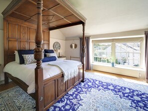 Leading from the hallway, a large staircase leads to five bedrooms, each with their own unique furnishings and decor. The largest bedroom has a Tudor barrel-vaulted ceiling and wooden Tester bed. Another bedroom has original oak beams and a high, pitched ceiling. Two other bedrooms have newly fitted en-suites and the refurbished main bathroom houses a shower, free standing bath and double sink unit.