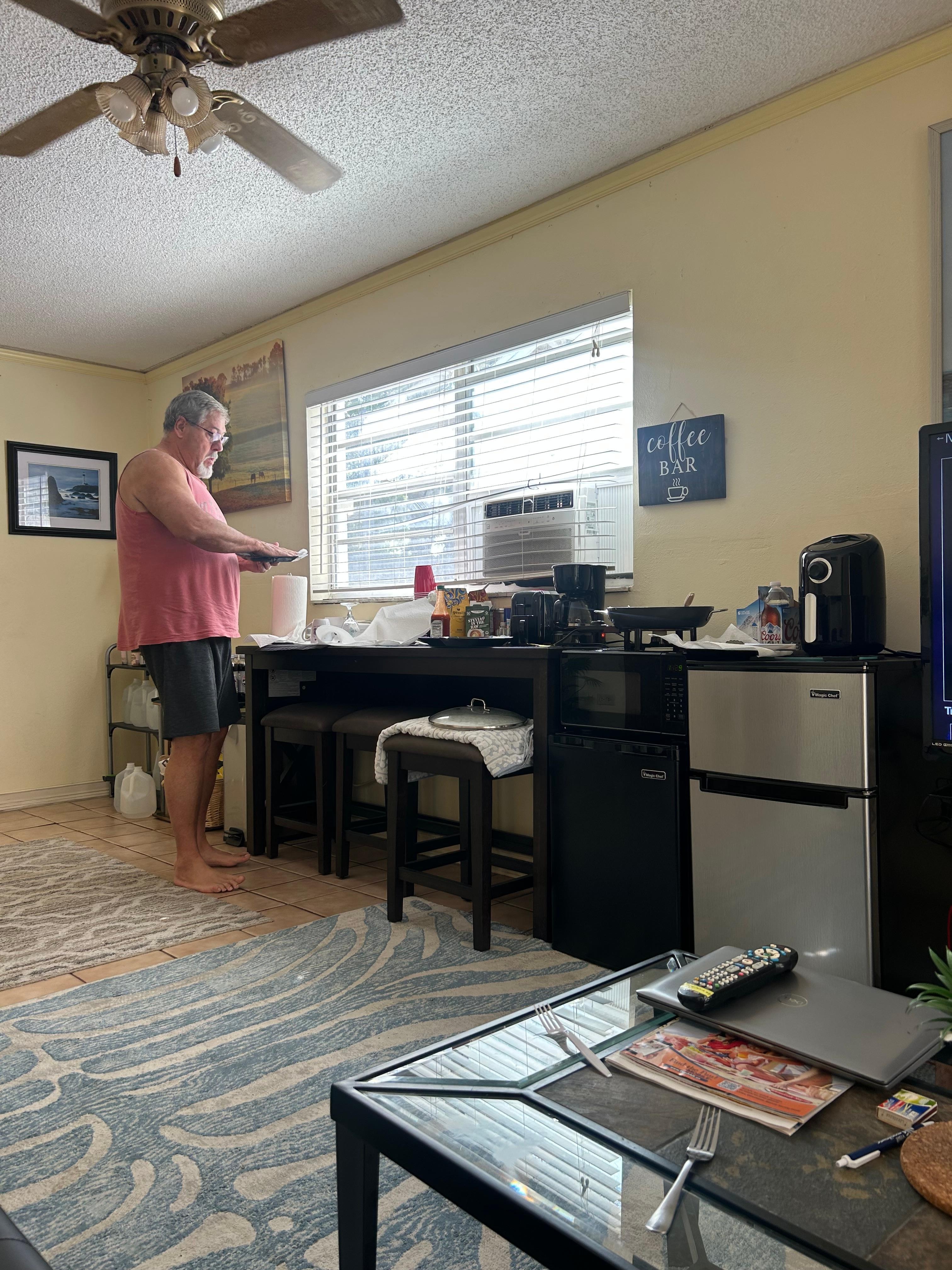 Very clean. Colleen was very sweet and will wash your dishes since there’s not a sink in the kitchenette. She lives in the main part of the house. There is only an air fryer, microwave and electric skillet in the closet. She will take care of anything you need. Can’t beat the price. And the pool is kept clean.