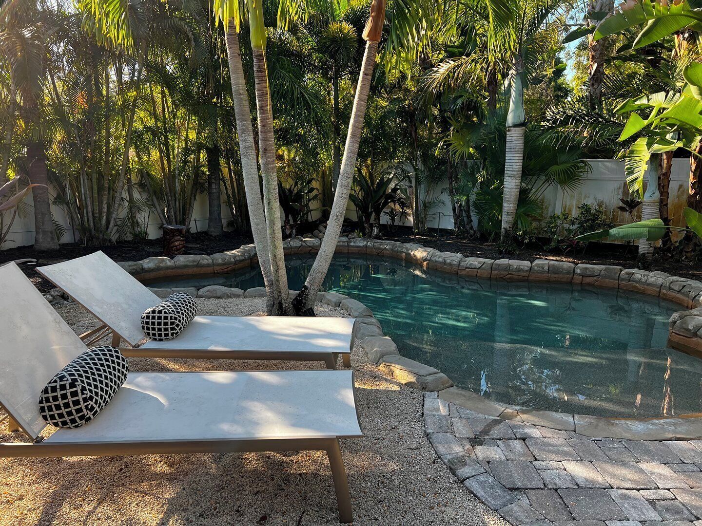 The house is a good size with plenty of space for large families to hang out inside and outside. The pool was clean, the heater was functional and the bbq grill was decent. Some of the chairs outside are broken or cracked, and I wish they had at least one table. The fire pit was not functional. The general landscaping of the house is very deteriorated and screen patio is slightly damaged.