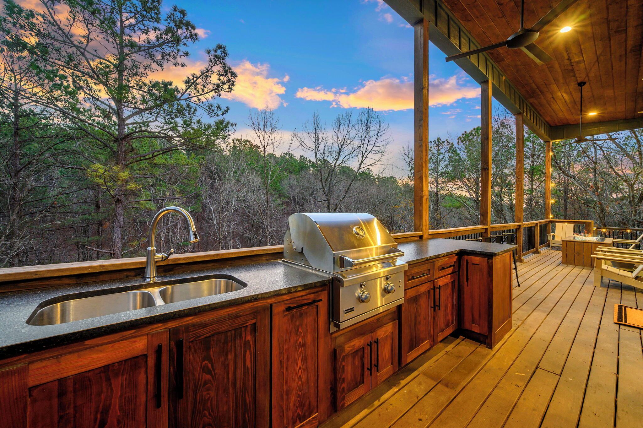 🌳 Outdoor Living Reconnect with nature and unwind in style: Oversized back deck with outdoor dining + BBQ grill (propane provided) 8-person hot tub Outdoor fireplace & fire pit (seating for 9) Comfortable patio seating surrounded by pines Short walk to a nearby stream