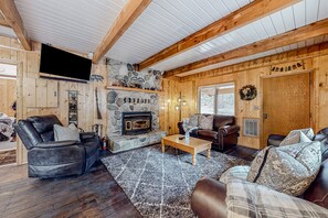 Wooded cabin with private hot tub, deck, firepit & fireplace - walk to the lake