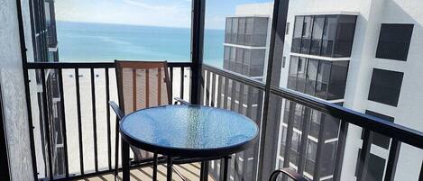 This penthouse vacation rental condo boasts 1400 sq. feet of living area and has three private screened lanais with spectacular panoramic views of the Estero Bay and the Gulf of Mexico.
