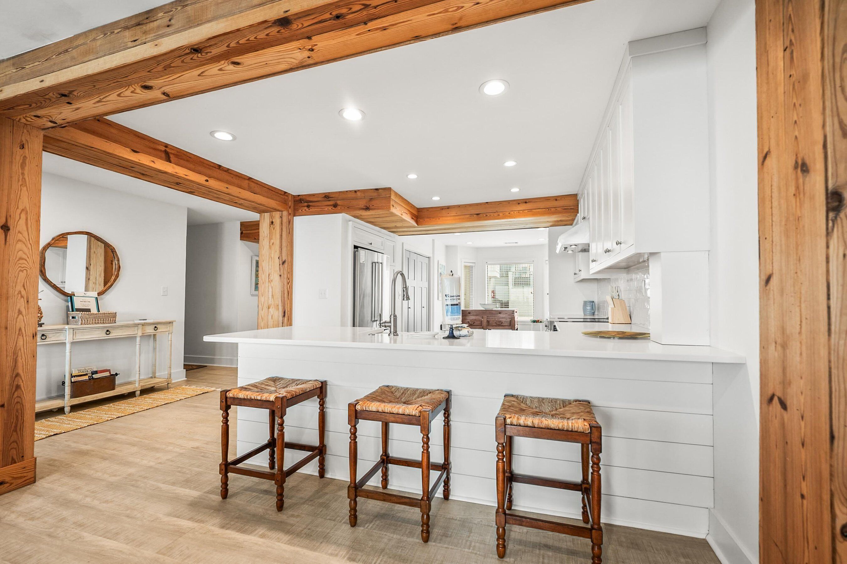 Featuring a large deck upstairs with new Polywood seating! An overhang was added to this deck in 2025 to provide shade and allow for use during rainy days. 2 car garage and 2 extra spaces in the driveway. The 3rd TV is in the living room and has Cable live television. High-speed Wi-Fi throughout the home allowing you to stay connected. Full-size stainless-steel appliances in the kitchen. Standalone mini fridge allows you extra room to store drinks. Outdoor shower for easy beach cleanup. Large open living and dining room with a breathtaking ocean view. At low tide, the beach is accessible from the access in the backyard. During the rest of the day, you will need to explore the central part of the island for a 24-hour beach access.